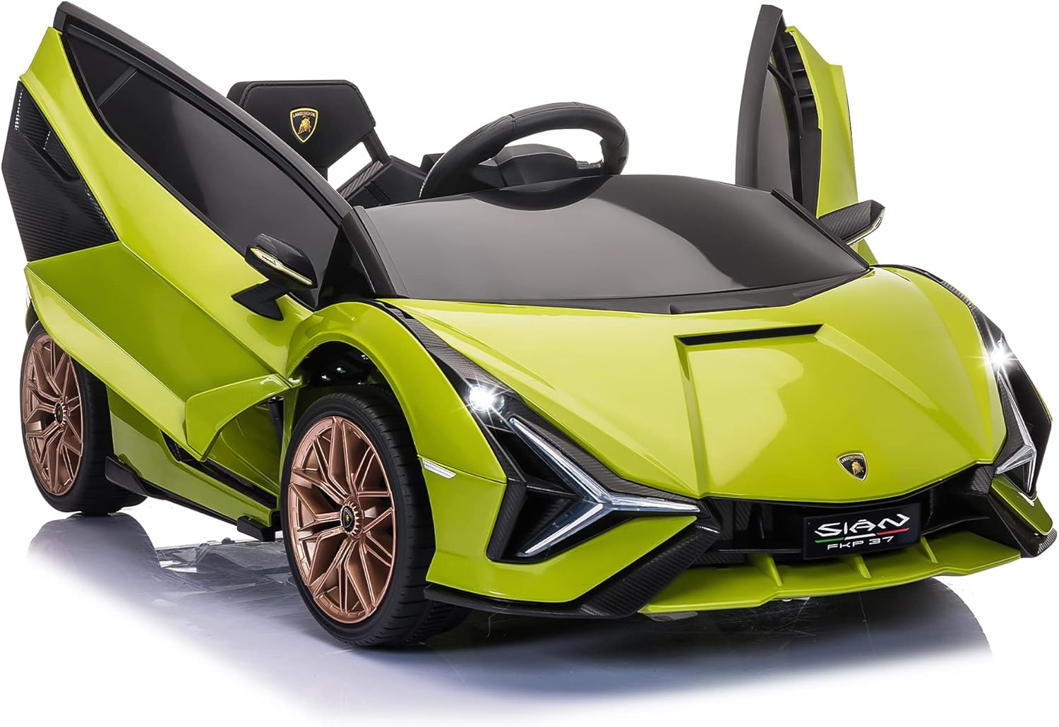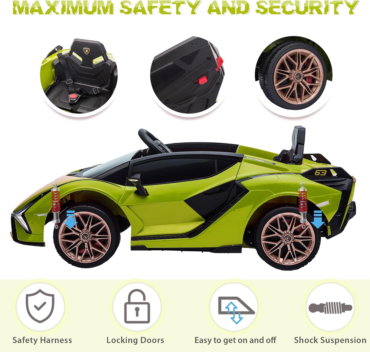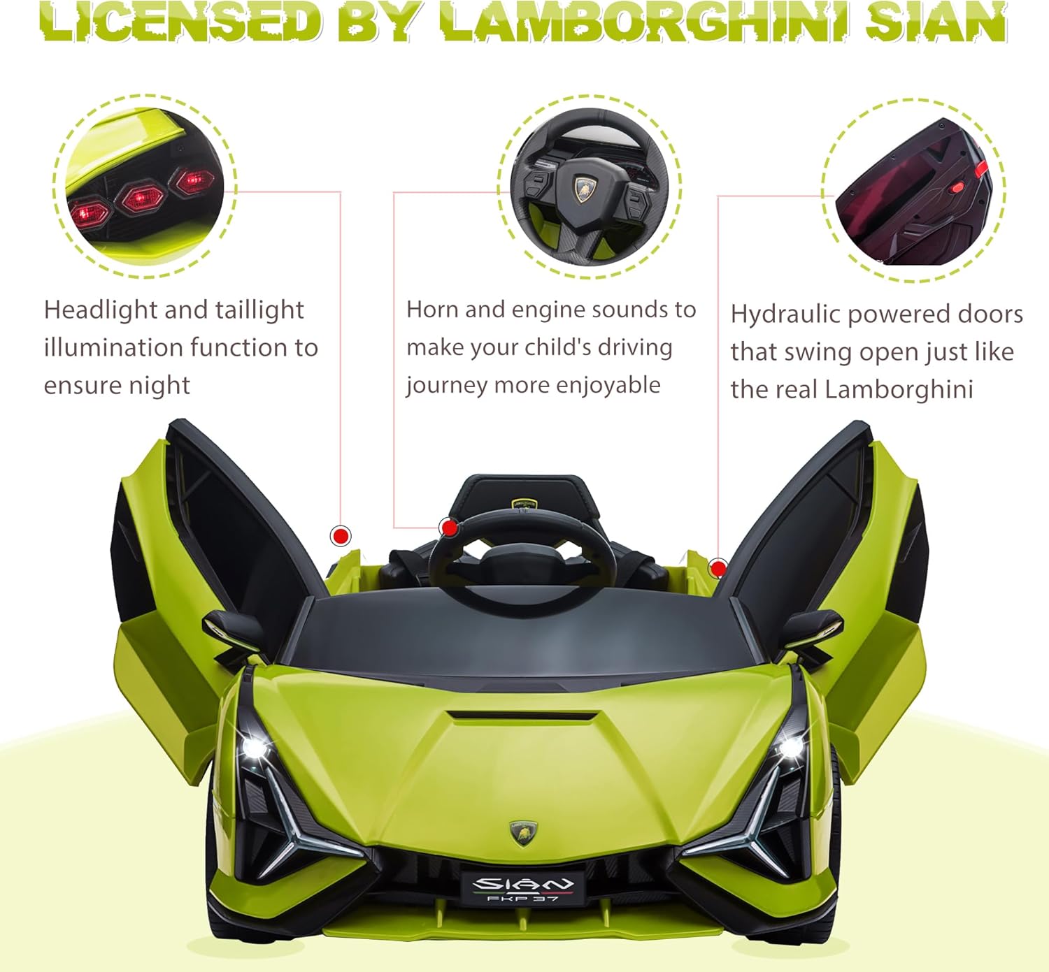 TOBBI Electric Ride On Car Toy for Kids to Drive, 12V Battery Powered Licensed Lamborghini SIAN with Parent Remote Control for Toddlers 3-6 Years w/Functions Spring Suspension/Horn/LED Lights-Green