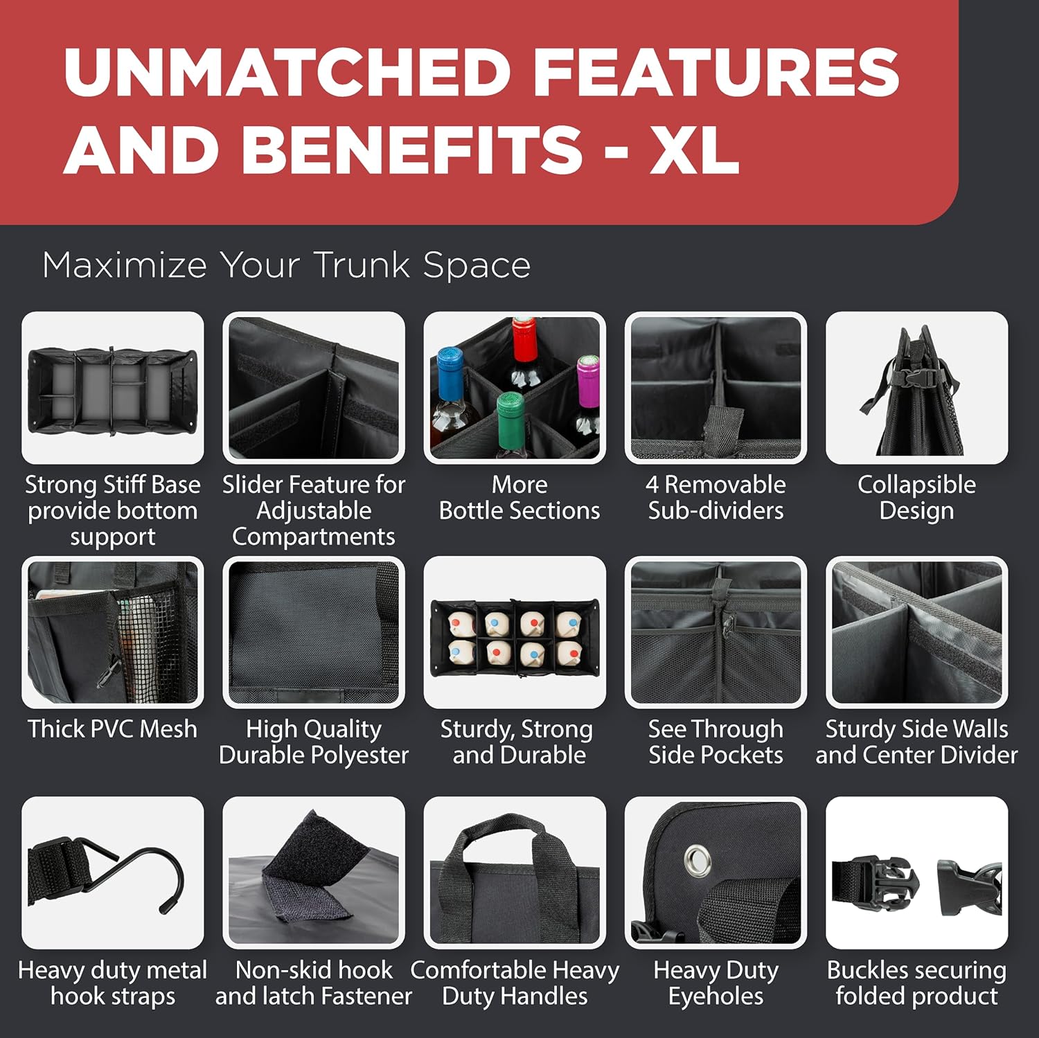 - Innovative design and multi-faceted design - The cargo storage container was designed and invented after months of testing and sampling with the best factories. It combines all the strengths and addresses the shortcomings of existing trunk organizers. It has the most pockets, 6 multi compartments, 4 removable sub-dividers, can be folded half-length as a seat organizer, light weight yet unbreakable. It is fully-collapsible for easy storage, and is designed to prevent your cargo from sliding