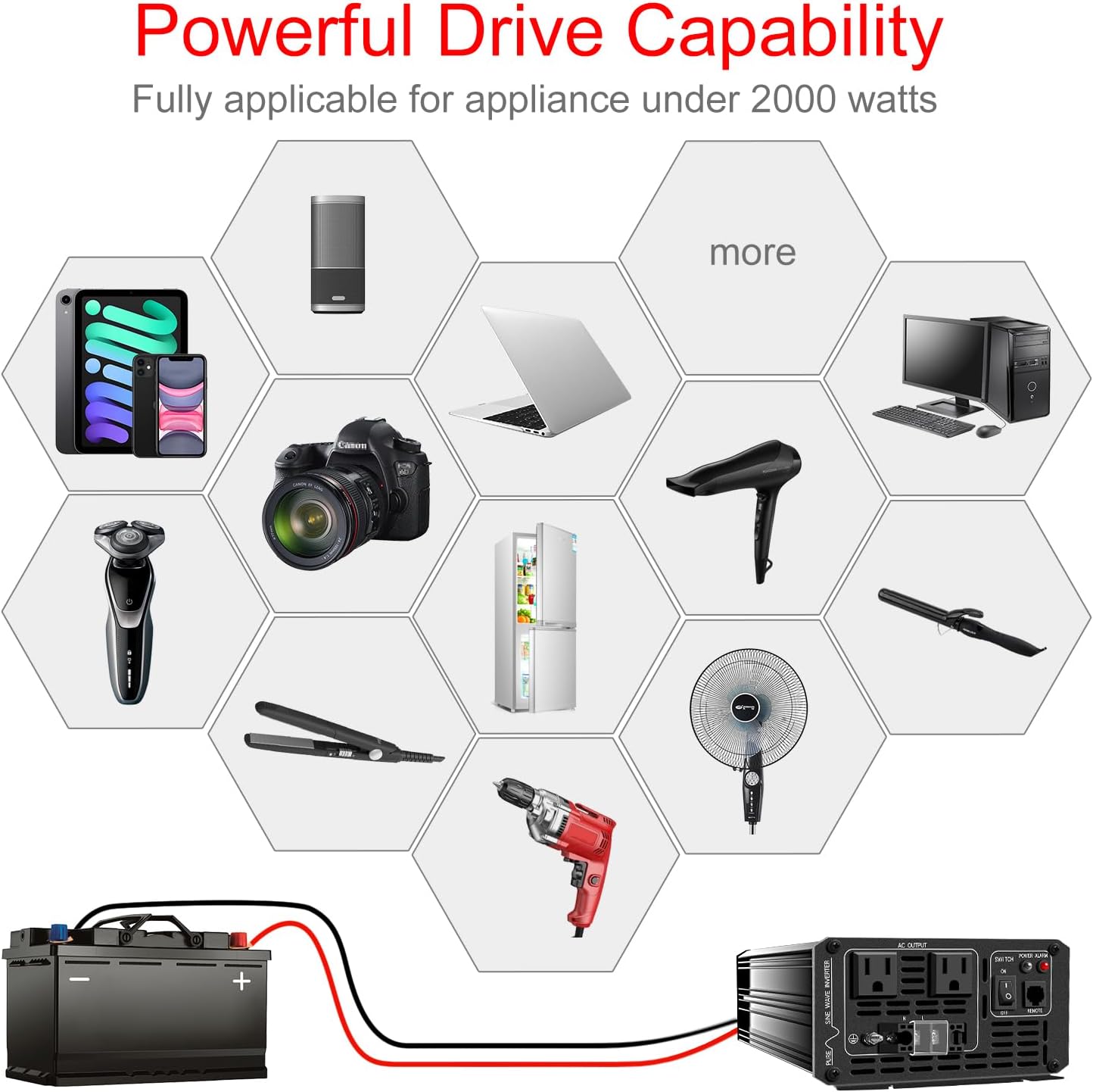 - [True Pure Sine Wave Power Inverter] True rated continuous 2000Watts pure sine wave output power and 4000 Watts peak power.LCD display.Perfects for off-grid system,Lower THD,Less wear,Strong inductive Loads Capability.It has little interference with radios, communication and precision equipment.It's also recommended by most cordless tool manufacturer that a pure sine wave inverter is used to ensure long battery life.