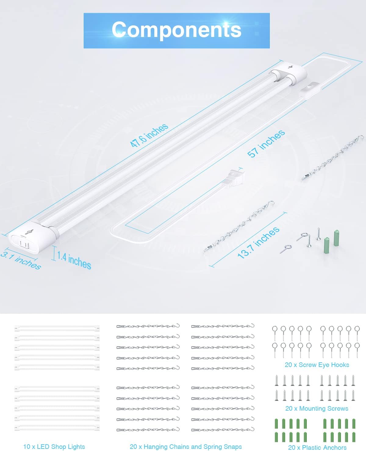 - 💡Easy Installation - Plug & Play. These 4ft led shop lights can be directly mounted to the ceiling or suspend from the ceiling in your garages, workshops, basements, warehouse, etc. Hanging chains and mounting screws are both included. Quick and easy setup.