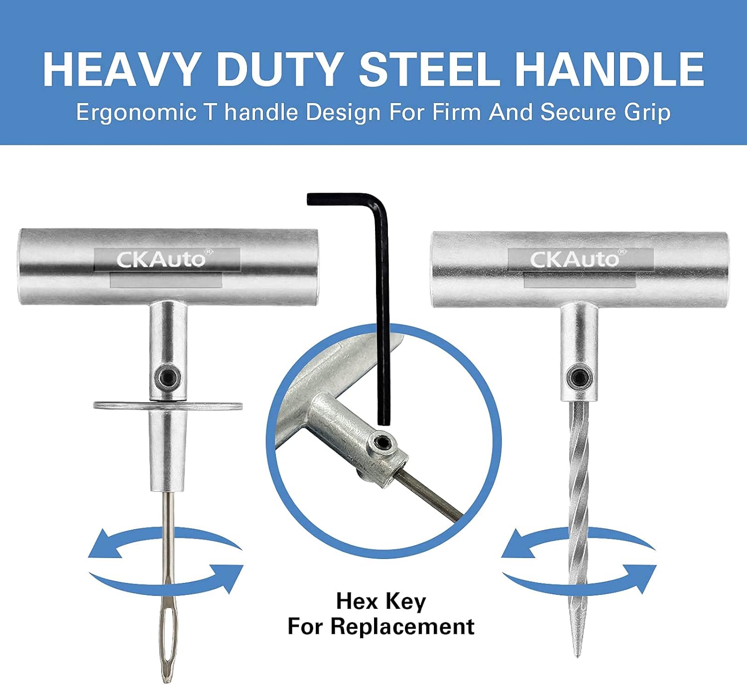 - 【Car Emergency Kit】-- CKAuto Universal Tire Repair Kit includes T-handle Insertion Tool x 1, Insertion Tool Replacement x 1, T-handle Probe Spiral x 1, Probe Spiral Replacement x 1, 4" Repair Plugs x 20, Valve Stem Caps x 4, 4-Way Valve Stem Tool x 1, Jar of Lubricant x 1, "L" Hex Key x 1, Valve Cores x 4, Knife x 1, Bag x 1. Meet all your needs on tire repairing work totally.
