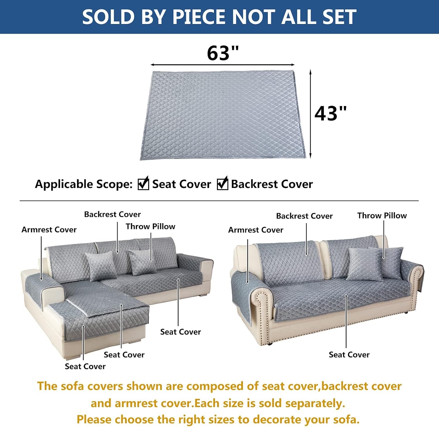 Eismodra Couch Cover,Sectional Couch Covers,Sofa Covers for 3 Cushion Couch,Anti-Slip Sofa Slipcovers for Dogs Cats Kids Loveseat Recliner L Shaped Armrest,Light Gray 43''x63''(Only 1 Piece)