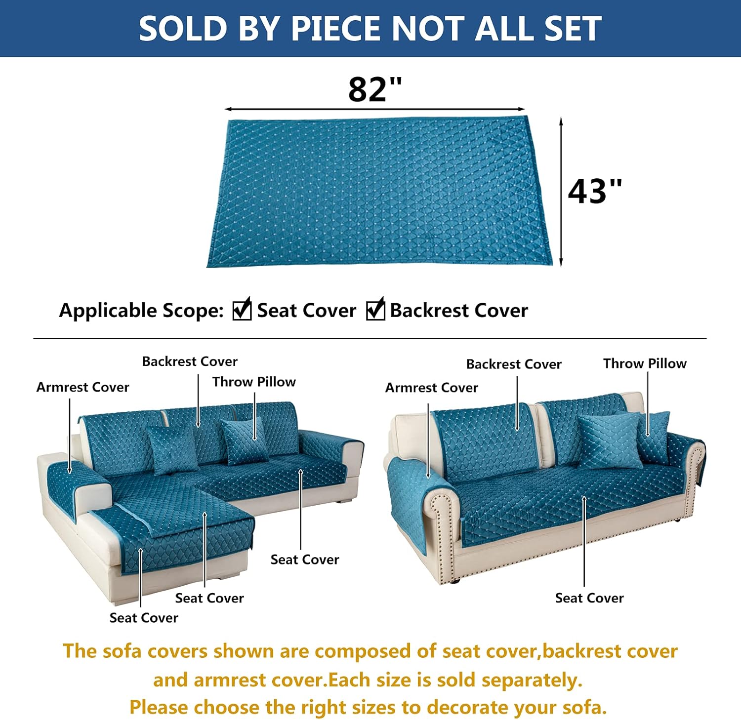 Eismodra Couch Cover,Sectional Couch Covers,Sofa Covers for 3 Cushion Couch,Anti-Slip Sofa Slipcovers for Dogs Cats Kids Loveseat Recliner L Shaped Armrest Backrest,Blue 43''x82''(Only 1 Piece)
