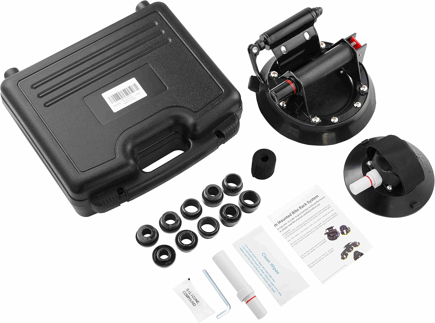 - ZUOS vacuum mount bike carrier system uses a 8-inch suction cup for the fork mount and a 6-inch cup for rear wheel. Each suction cup uses durable UV and weather resistant concave rubber pad so that they can be attached to flat and cured surfaces