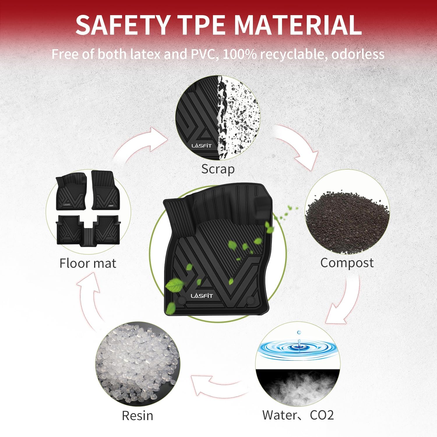 - Premium TPE Material : LASFIT floor mats made of 100% brand new TPE material (Thermoplastic Elastomer) for a comfortable and soft touch and exquisite finish. More friendly to the elderly, children and pets. Exclusively designed anti-slip studs for more safety and shock and sound absorbent.