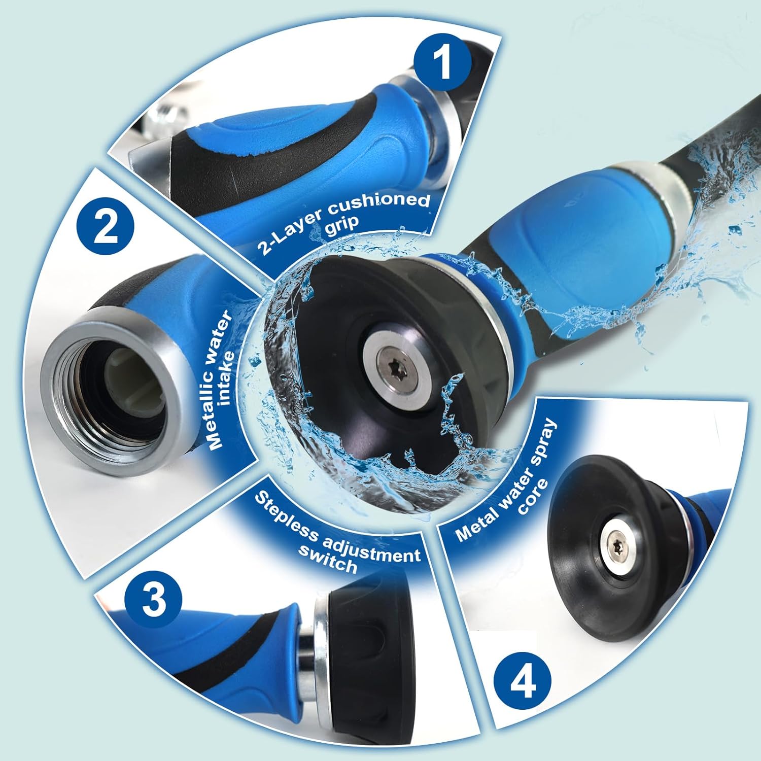 - COMFORTABLE HANDLE HOSE NOZZLE β Made of High density Rubber and High Grade rustproof metal, the hose nozzle come with High-pressure and powerful jet, large area irrigation. The water outlet mode and size can be adjusted to easily regulate various situations. The ergonomically-designed handles are softly cushioned, anti-slip and comfortable. The flexible garden hose nozzle is very durable and easy to use.