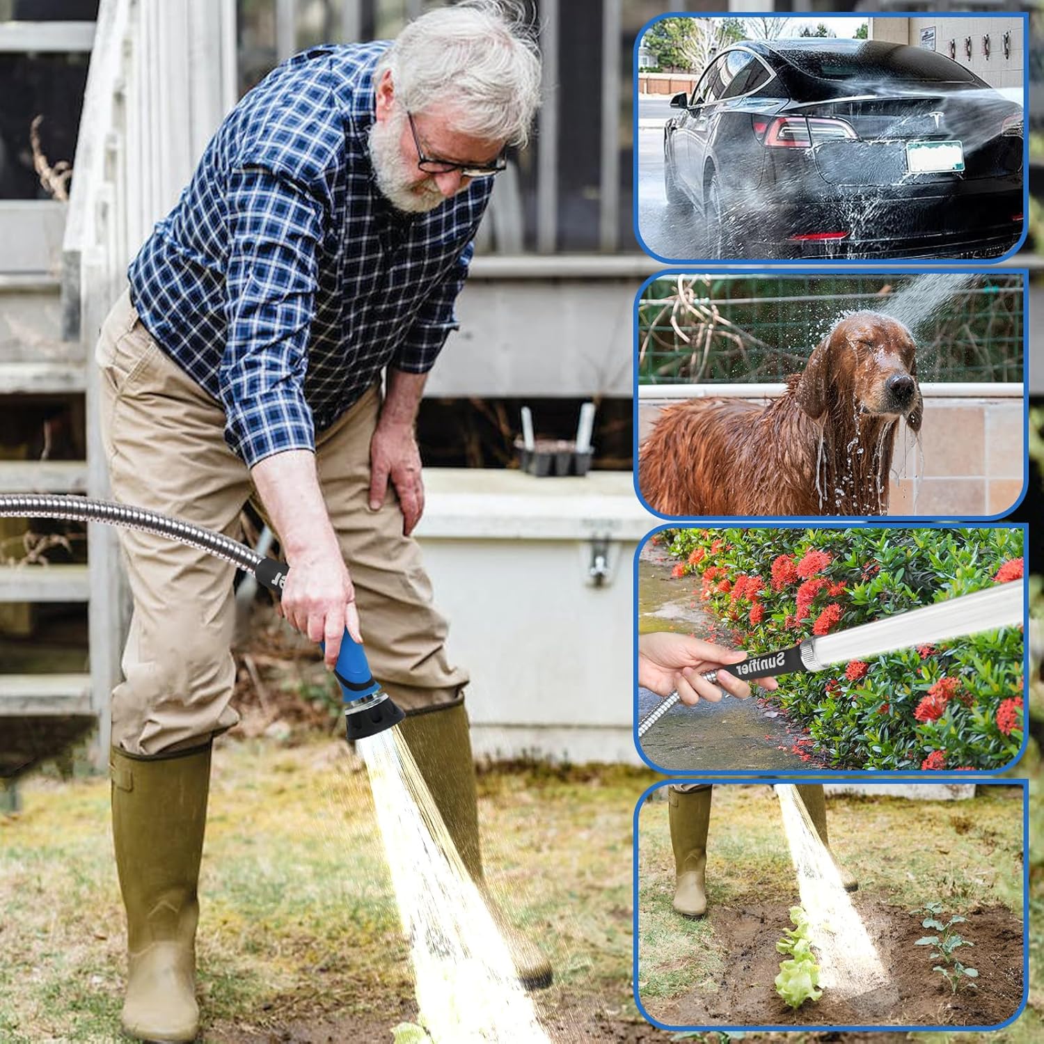 - FLEXIBLE & NO TANGLE - Metal garden hose can be bent to a large degree without tangling and kinking. The body of the hose is encased in a sturdy stainless-steel outer layer allows for a consistent, steady and high-pressure water output, non expandable, this flexible garden hose does not expand or retract ensure a steady and uninterrupted flow of water. The heavy duty garden hose is easy to roll up and store after use.