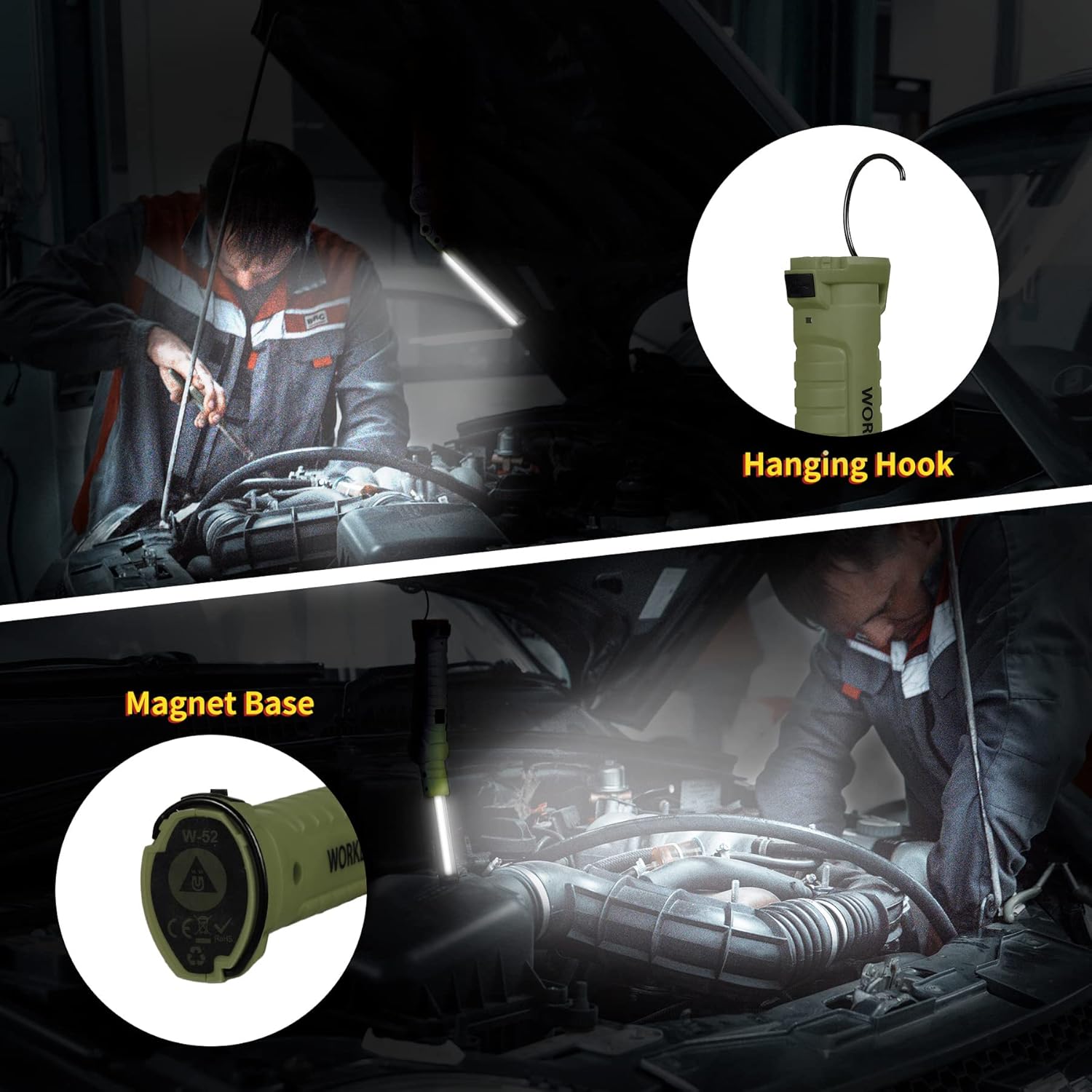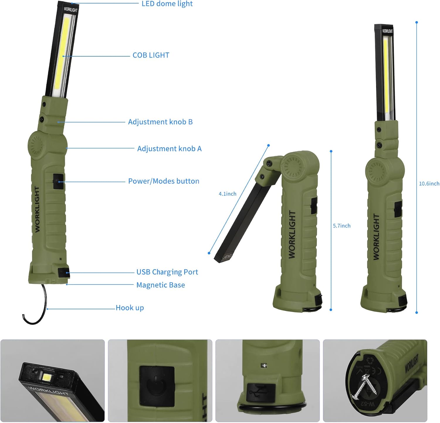 Suranew LED Worklight Flashlight, COB Rechargeable Work Lights with Magnetic Base 360 Degree Rotate and 5 Modes Portable Flood Light Inspection Construction Light for Car Repair (Army Green, 2 Pack)
