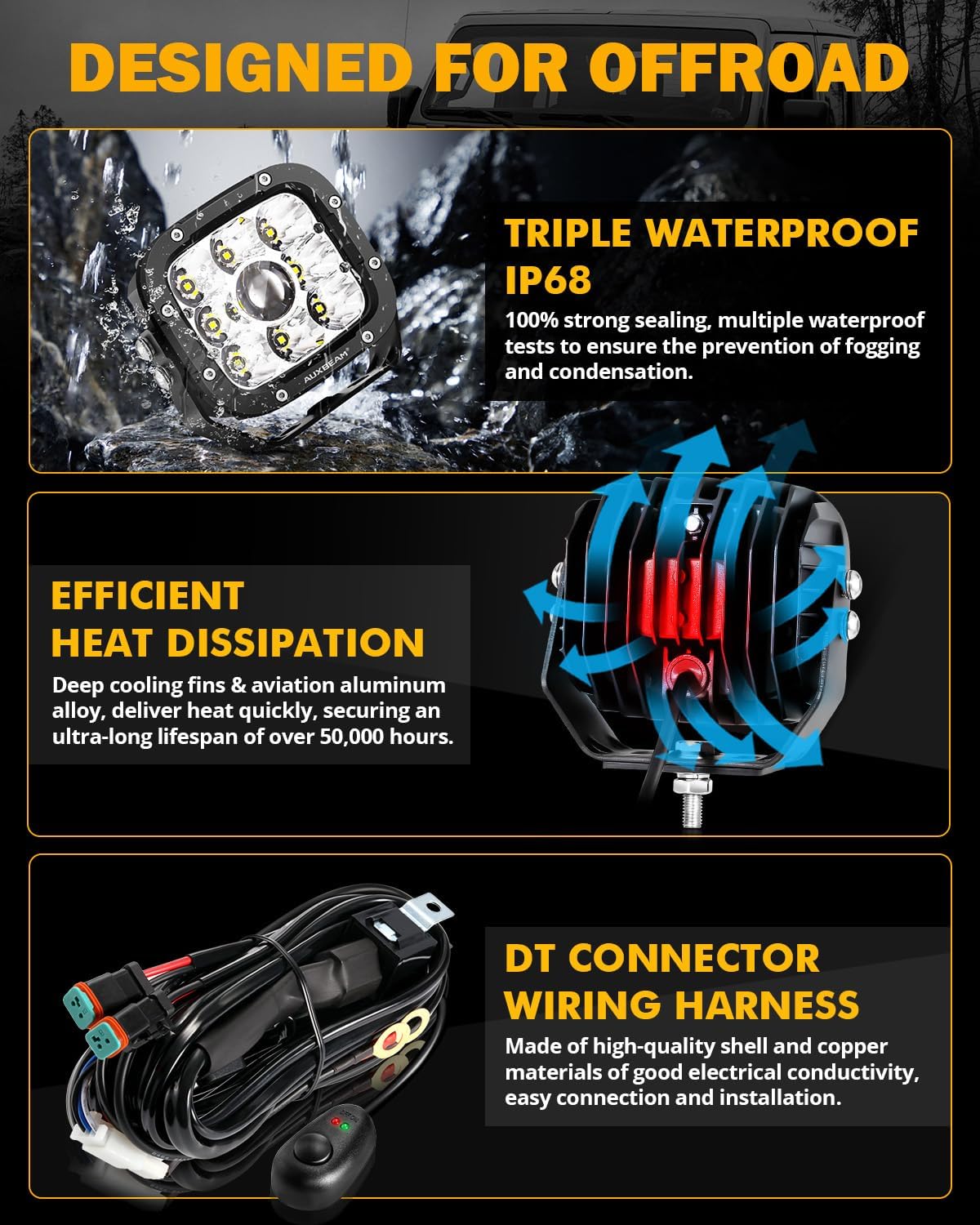 - SUPERB MATERIAL MADE, Durable Construction. Auxbeam 5 inch ditch light features a rugged, built-in superior 6063 and ADC12 aluminum housing that effectively accelerates heat dissipation and maintains a safe temperature, ensuring stable lighting output and durability. With built-in EMC, it completely isolates electromagnetic waves, preventing interference with car audio and onboard computers. The lifespan exceeds 50,000 hours