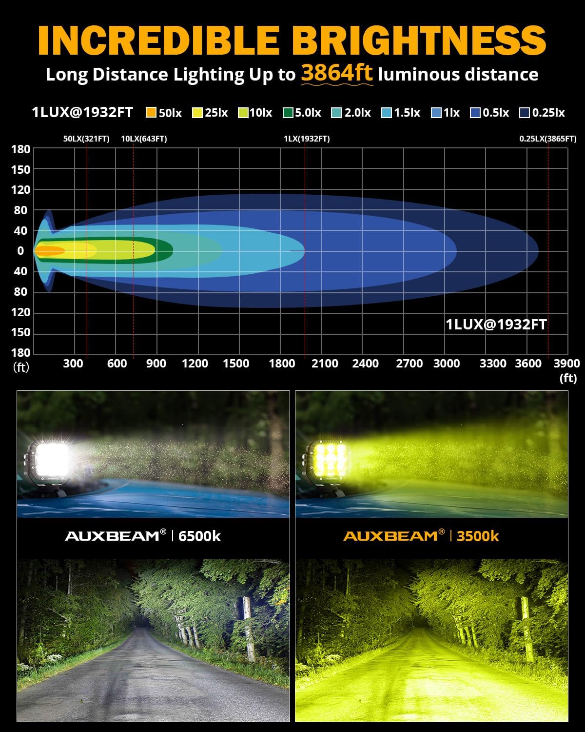 - SPOT BEAM PATTERN, High Penetration. Auxbeam 5" Offroad Light delivers the ultimate off-road beam performance. With a powerful 110W output and a top-of-the-line 7035 LED chip at the center, plus 8 additional 5050 LED chips, it provides an intense 1Lux@598m and an impressive 11,000 lumens. This light can reach up to 1.17km (3,864 feet), lighting up the entire road at night to ensure your driving safety