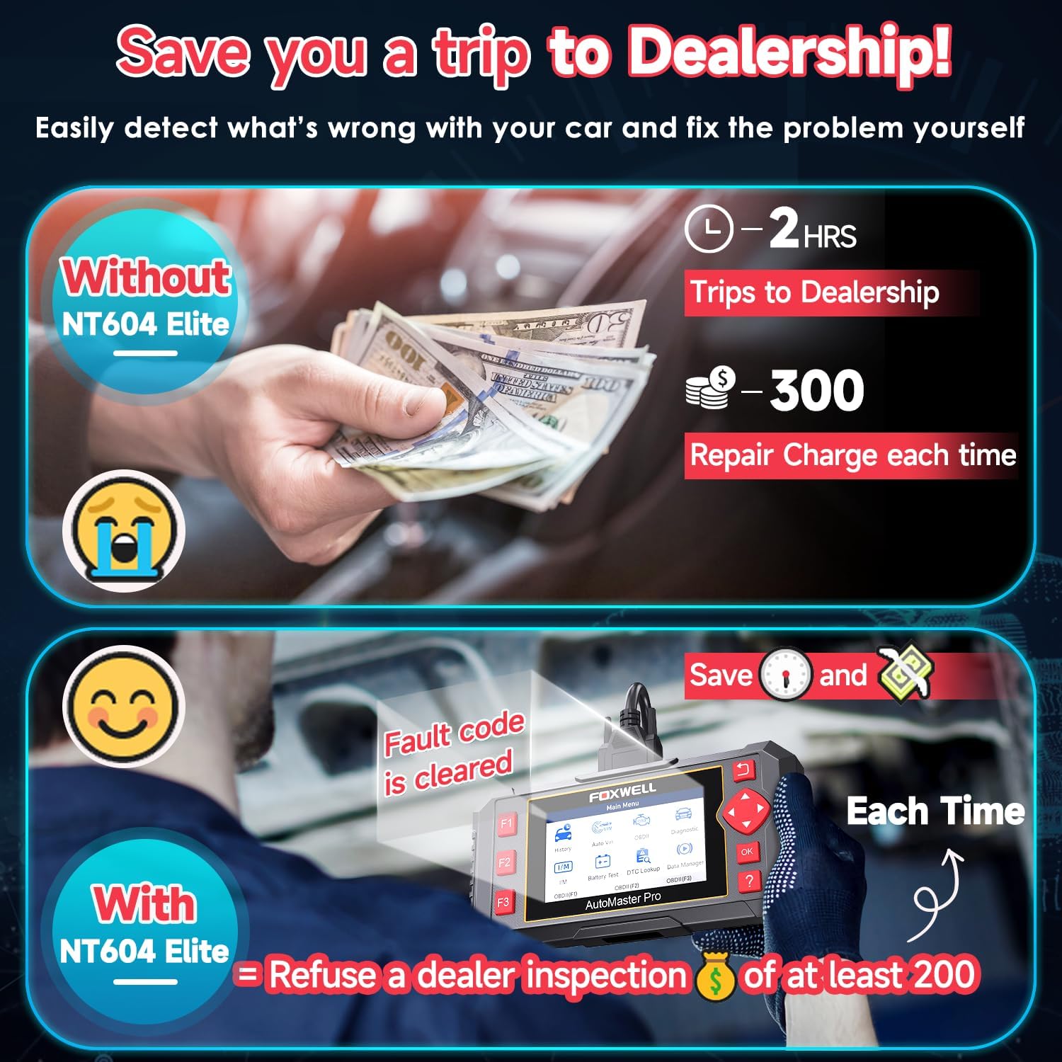 - 【Why Choose NT604 Over Basic Code Readers?】The NT604 incorporates all features found in FOXWELL NT201/NT301 and other basic code readers on the market. Beyond their standard 10 OBDII functions, it adds deep diagnostics for the 4 most critical systems: ABS, SRS, Engine, and Transmission. After automatic VIN identification, NT604 thoroughly checks potential faults one by one with a single scan, then presents consolidated results. It also generates diagnostic reports you can take directly to repair shops, saving inspection fees and labor costs.