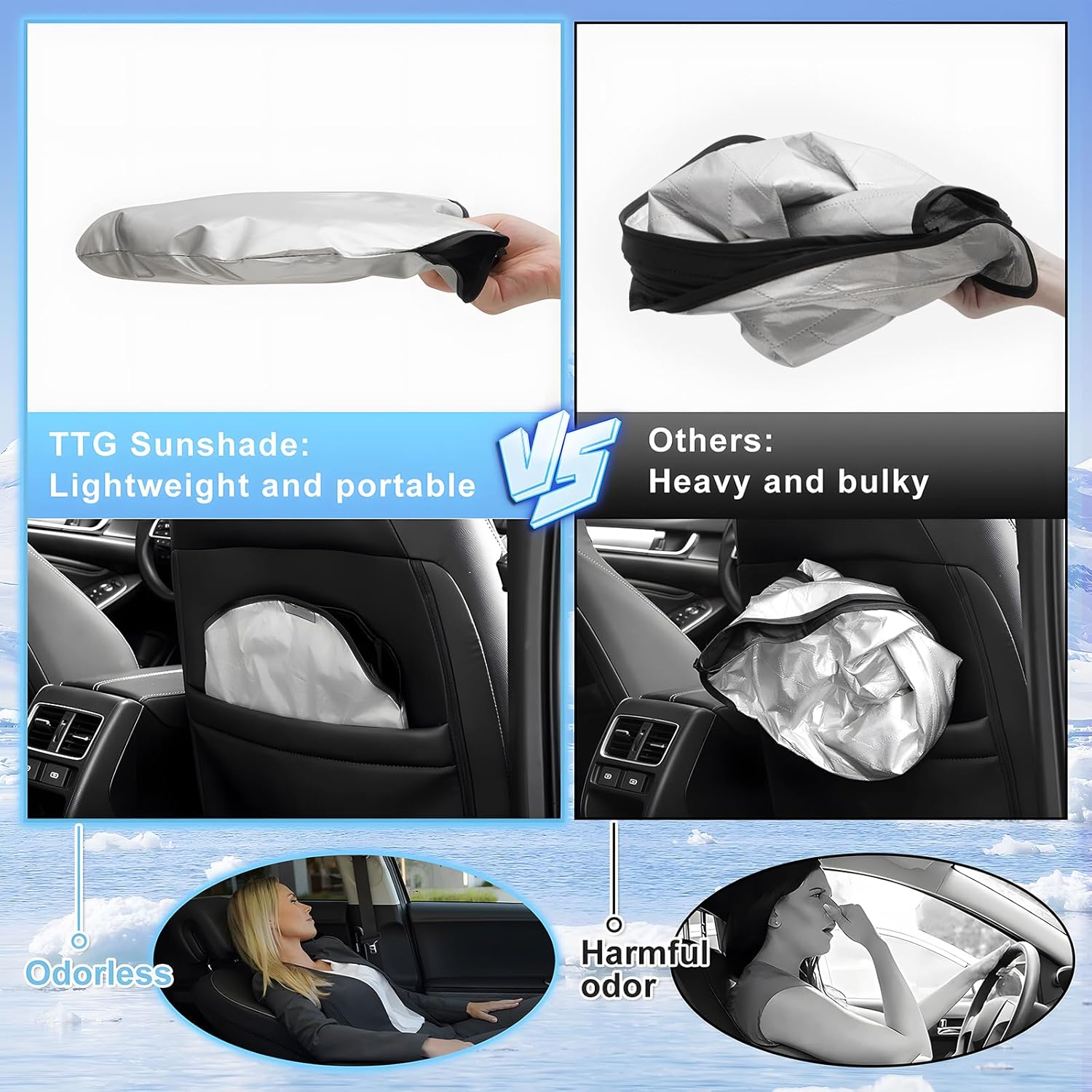 - Premium Material - Abandoning traditional silver-coated fabric, T TGBROS sun blocker for car windshield adopted a 240T high-density base fabric combined with a polyester fiber high-temperature reflective cooling coating, newly Upgraded.