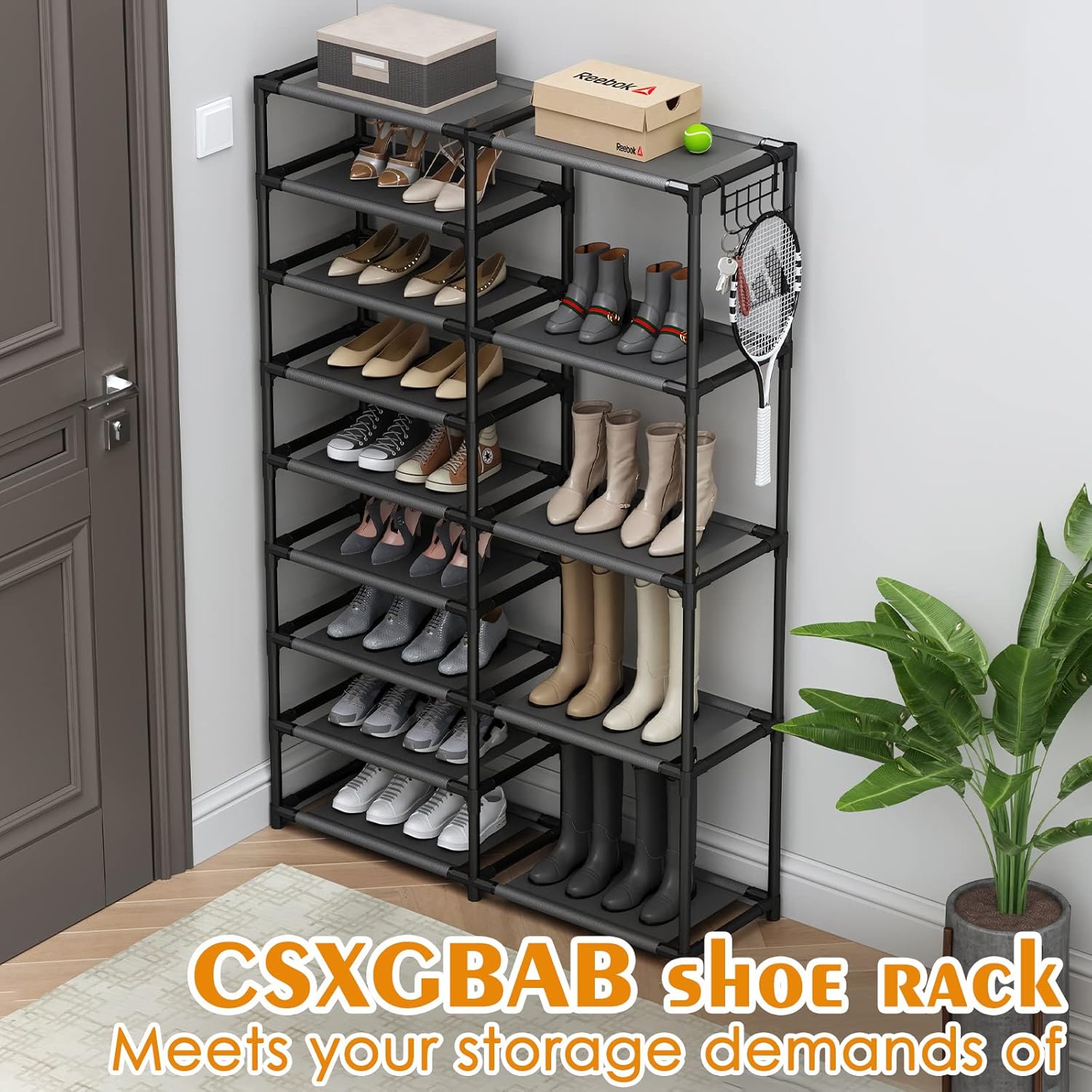 Tall Garage Shoe Rack Large Capacity,Two Rows Versatile Hooks Storage Boot Shelf Black 24-35 Pairs