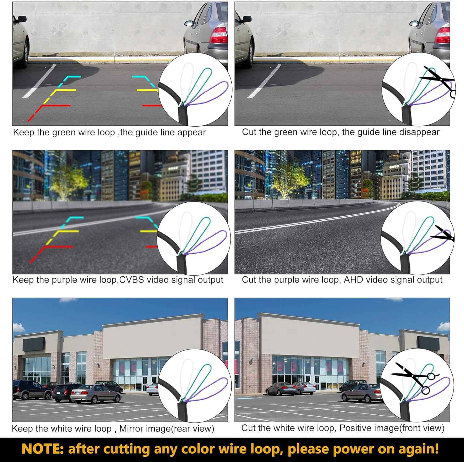 - Hitch reverse camera's housing and brackets are metal and stainless, small size and with 2 in 1 mount option design ( license plate or bracket surface mount ). Also it is built in 4 multifunctional switching wire loops: cut the white loop for front view, cut the green loop to remove the guidelines, cut the purple and blue wire loop to separately choose AHD and TVI format video signal output.