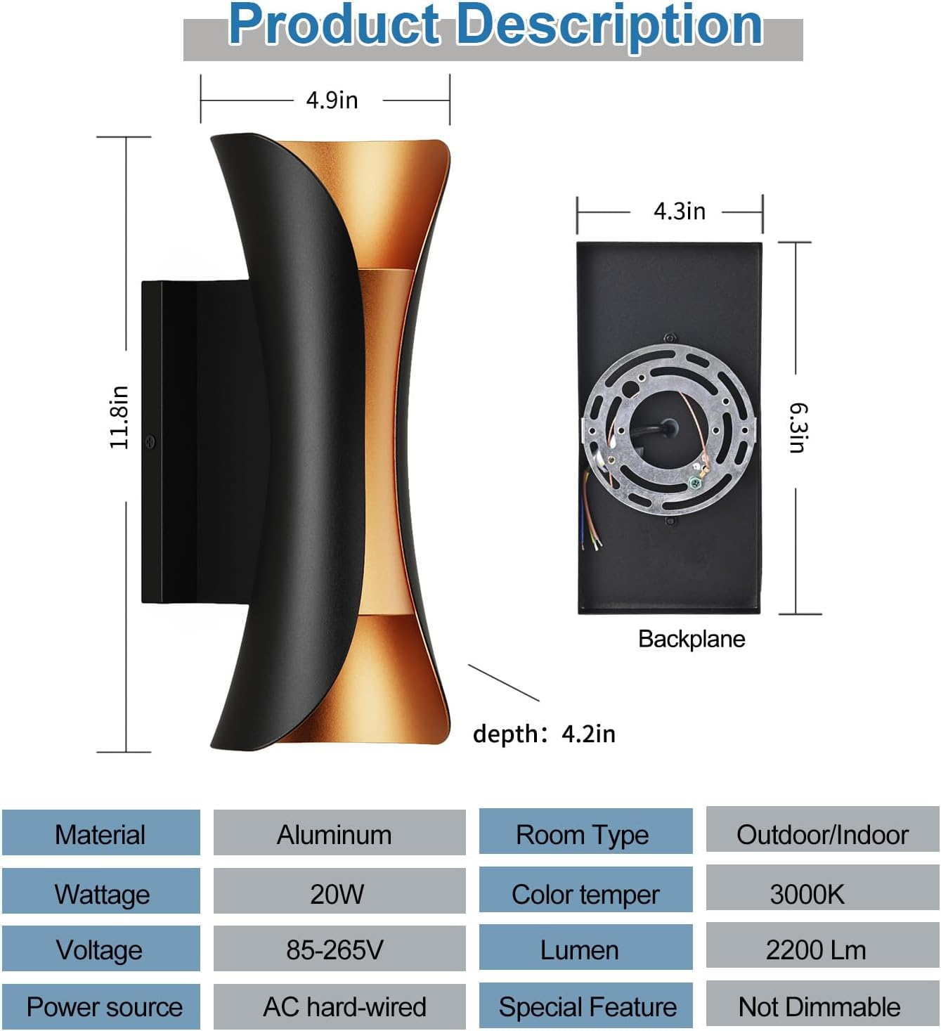 - 【LED Sconce Light Source】Exterior wall sconce 20W COB light source with 3000K color temperature, providing soft and energy-saving bright light. voltage of 85V-265V, (note: not dimmable)