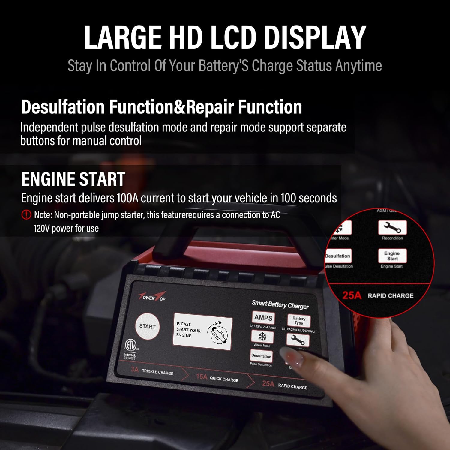 TowerTop 3/15/25 Amp Car Battery Charger, 12V Fully Automatic Smart Battery Maintainer with Engine Start, Auto Desulfator, Battery Repair, for All Lead-Acid and LiFePO4 Batteries