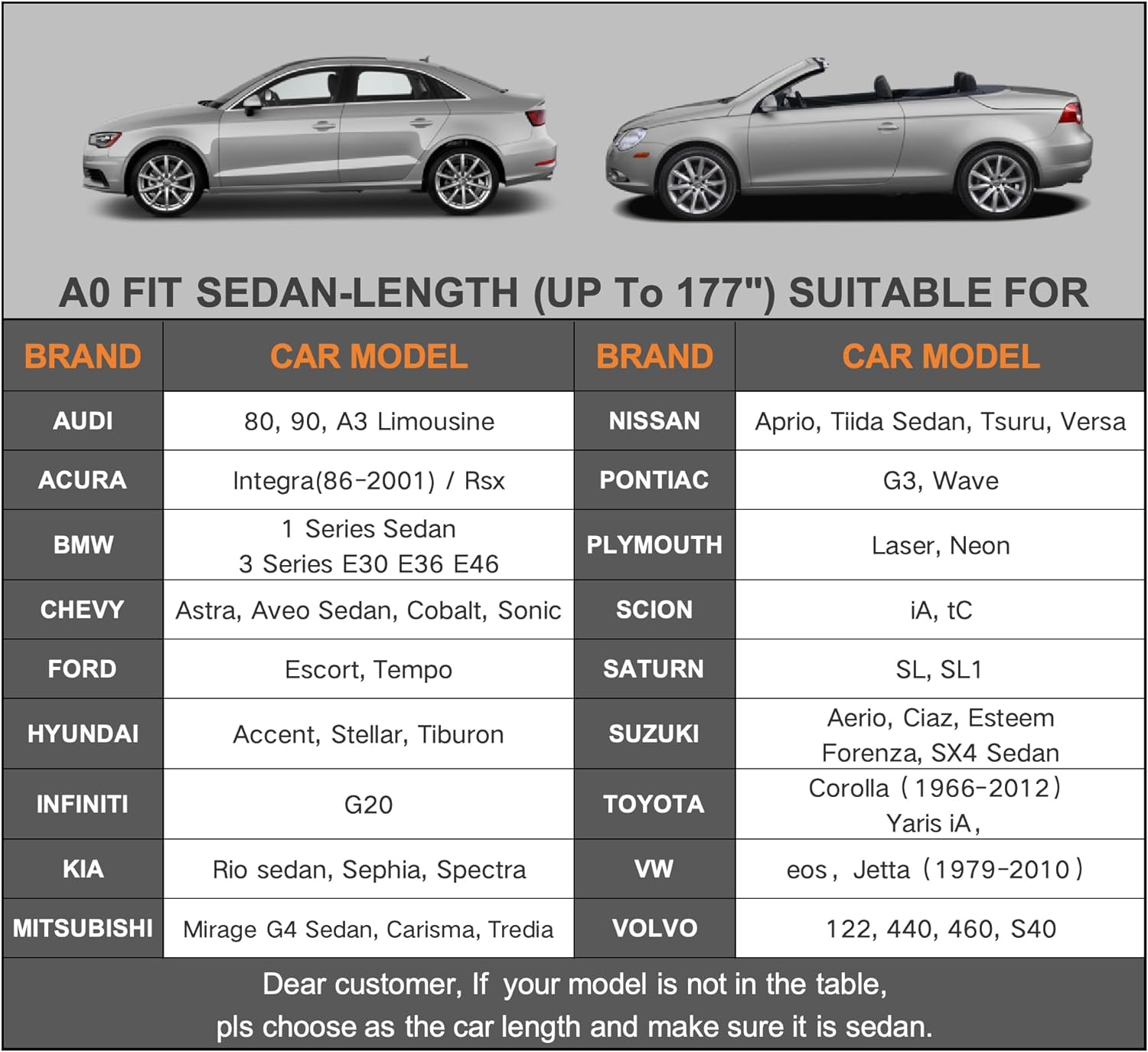- ăDimension A0ăâ Universal fit for sedan which length is up to 177 inch (NOT FOR SUV AND HATCHBACK). Suitable for Nissan Versa/350Z/370Z/200SX/240SX, Audi A3 sedan, Acura Integra/Rsx, Hyundai Accent, Mitsubishi Mirage, Volkswagen eos, Toyota Celica,Chevy Cobalt etc.