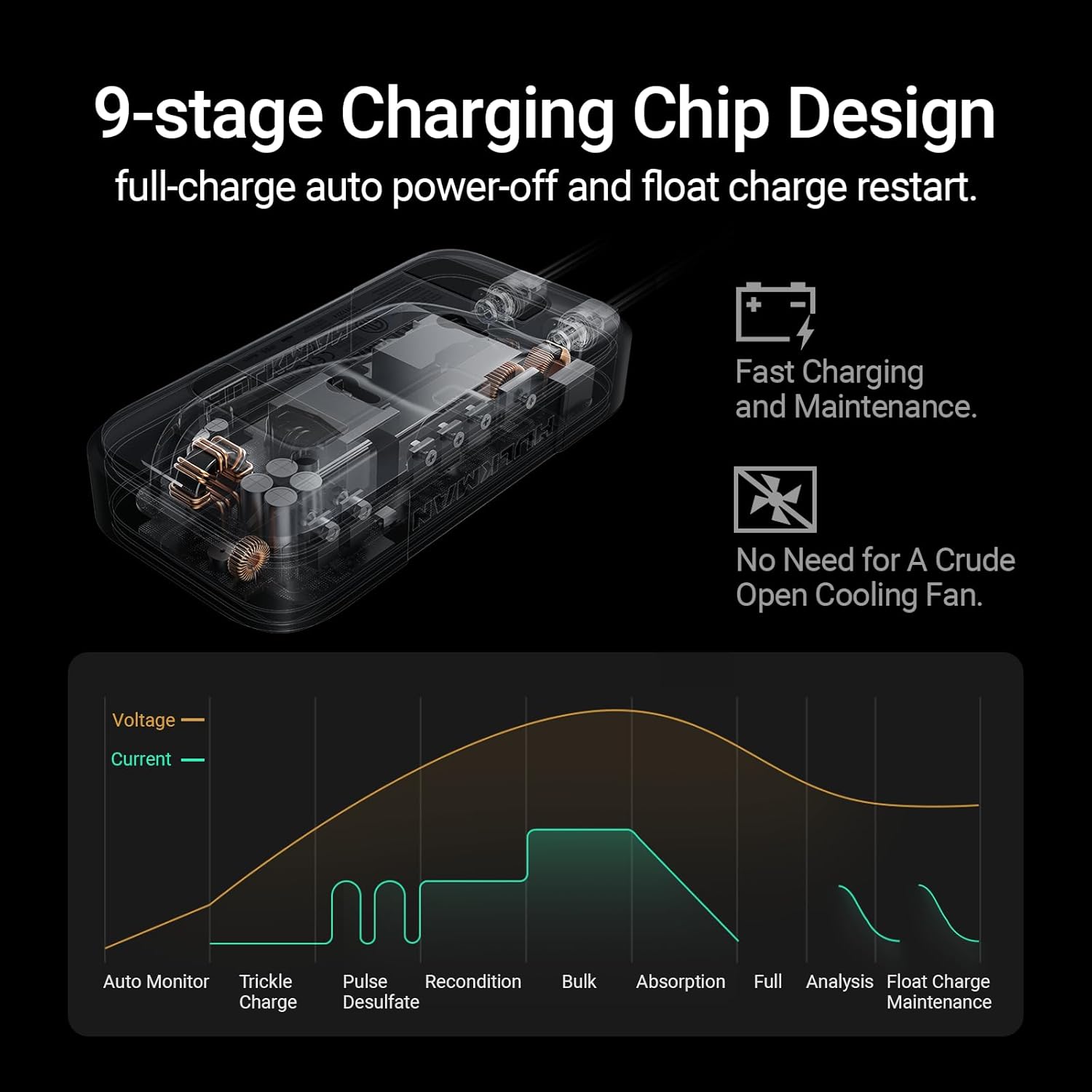 - 9 Stages Battery Maintainer β No need to worry about overcharging or overheating. With a smart chip, it optimizes car batteries by 9-stages charging. This tech enables full charge auto power-off and float charge restart, keeping the battery in peak condition without intervention