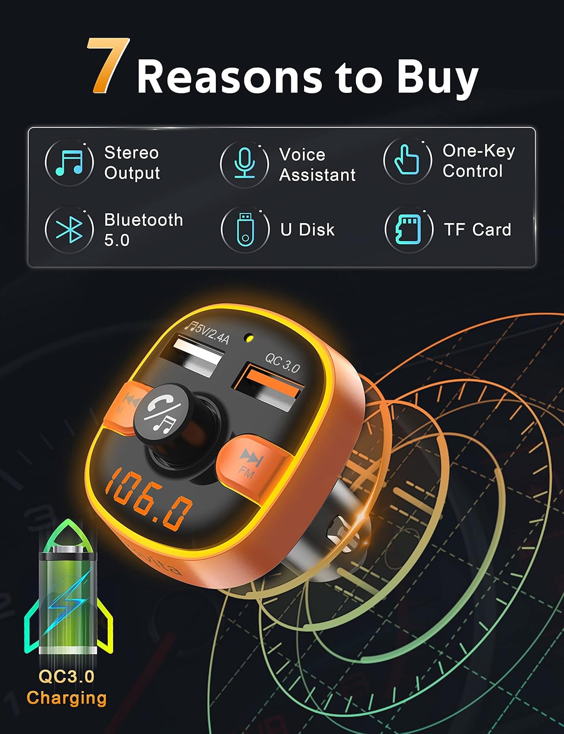 - 【Function Collection】 What are your expectations? Dual USB ports, QC 3.0 fast charge, Hand-free calls, Voice assistant, High-fidelity sound quality output, LED display, 7 colors and 2 modes of ambient light, Support U disk, TF card and Bluetooth 3 music playback modes. And what else? Please look forward to our new model.