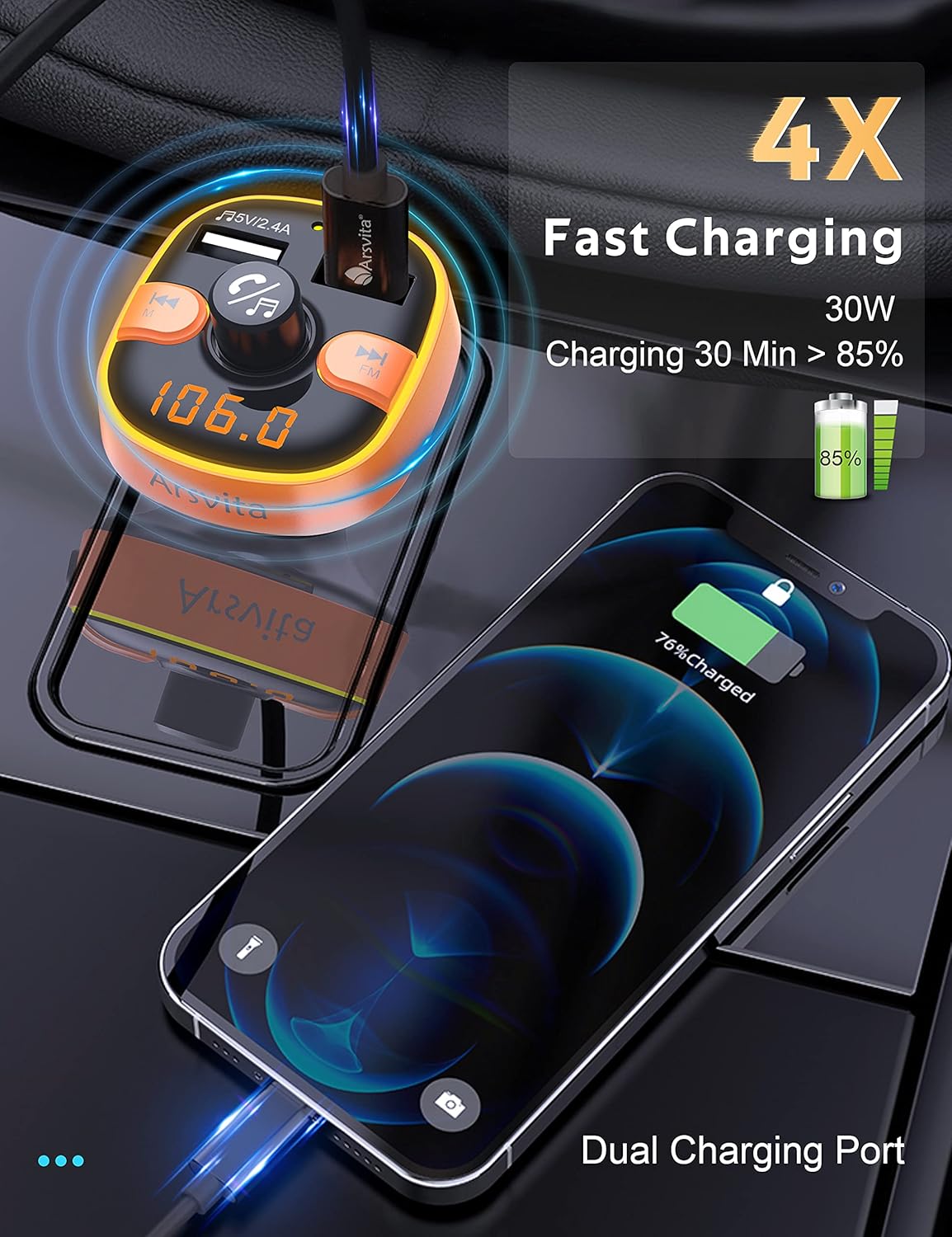Upgraded Arsvita Bluetooth FM Transmitter for Car, Radio Receiver/Audio Adapter with Dual Car Charger, Support QC3.0 Quick Charging, Hands-Free Calling and Hi-Fi Sound Playback, Orange