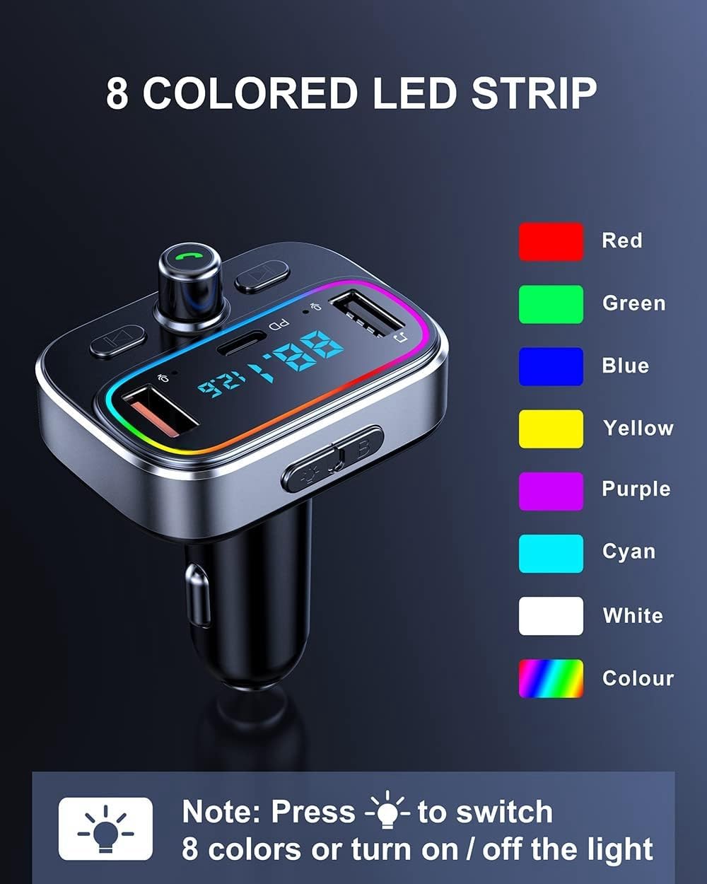 - 7 Colored LED Strip & Music Play Modes: FM Transmitter Bluetooth car adapter supports 7 colors LED backlight, including red / green / blue / yello / purple / cyan / silver white, will give you a visually stunning display of colors, which is a nice way to match the colors already in the car. You can stream music on your car stereo via Bluetooth/ USB Disk (โค32GB) / microSD Card (โค32GB).