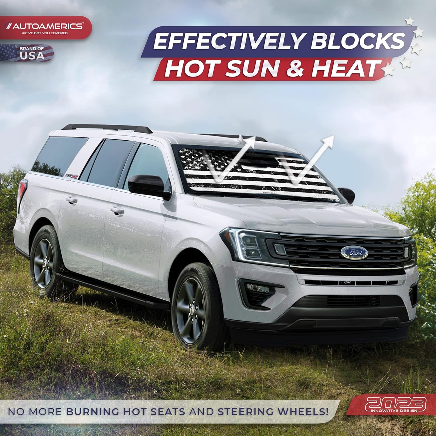 - Market-leading sun protection with an eye-catching American flag design. The new Autoamerics 1 piece USA windshield sunshades combines unbeatable sun reflecting and heat blocking capabilities. We achieve our market-leading protective performance by combining the finest reflective materials and innovative design to reflect the most scorching hot UV rays and heat.