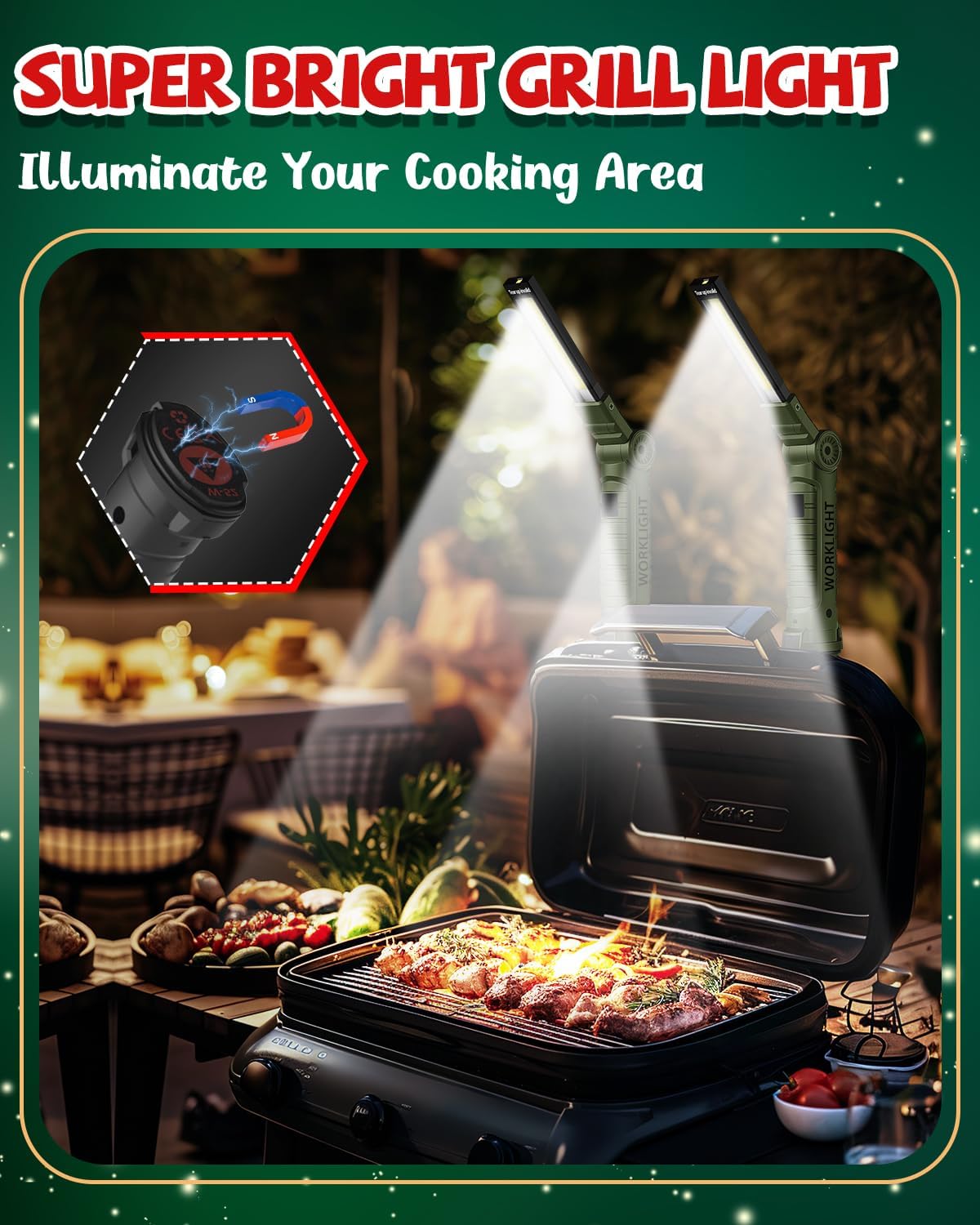 Coquimbo Tool Gifts for Men Him, Rechargeable LED Work Light Grill Light with Magnetic Base and Hook 5 Modes 360° Rotate Mechanic Light Birthday Gifts for Dad Husband Men (2 Pack Green)