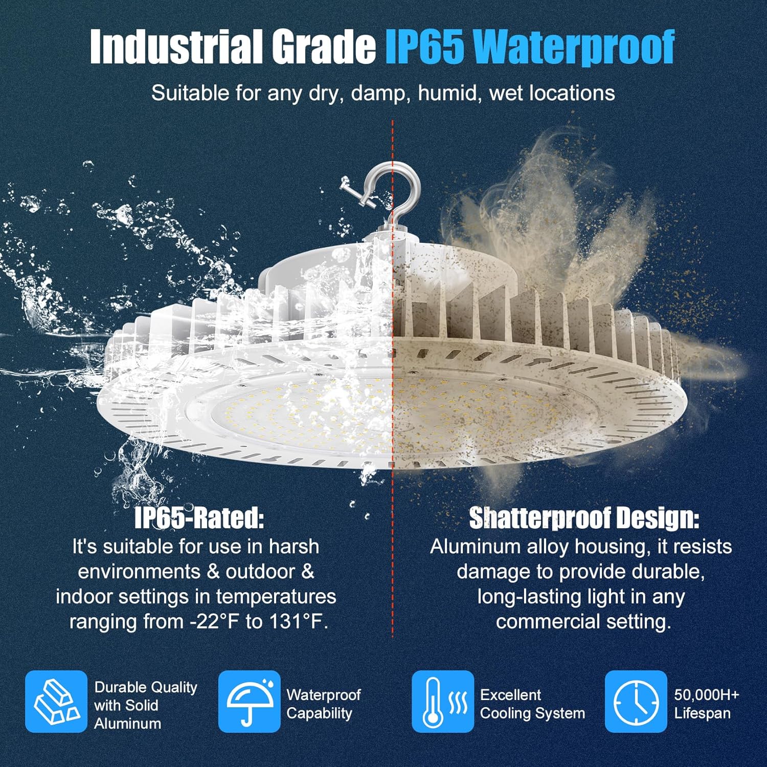 - 【High Brightness & Bill Saving】Saving up to 80%-200W energy-saving UFO led high bay shop light fixture at 5000K daylight provides 28,000lumens, up to 150 lumens per watt, equivalent to 800W MH/HPS, and high bay lights can instantly reduce electricity bills by 80%.