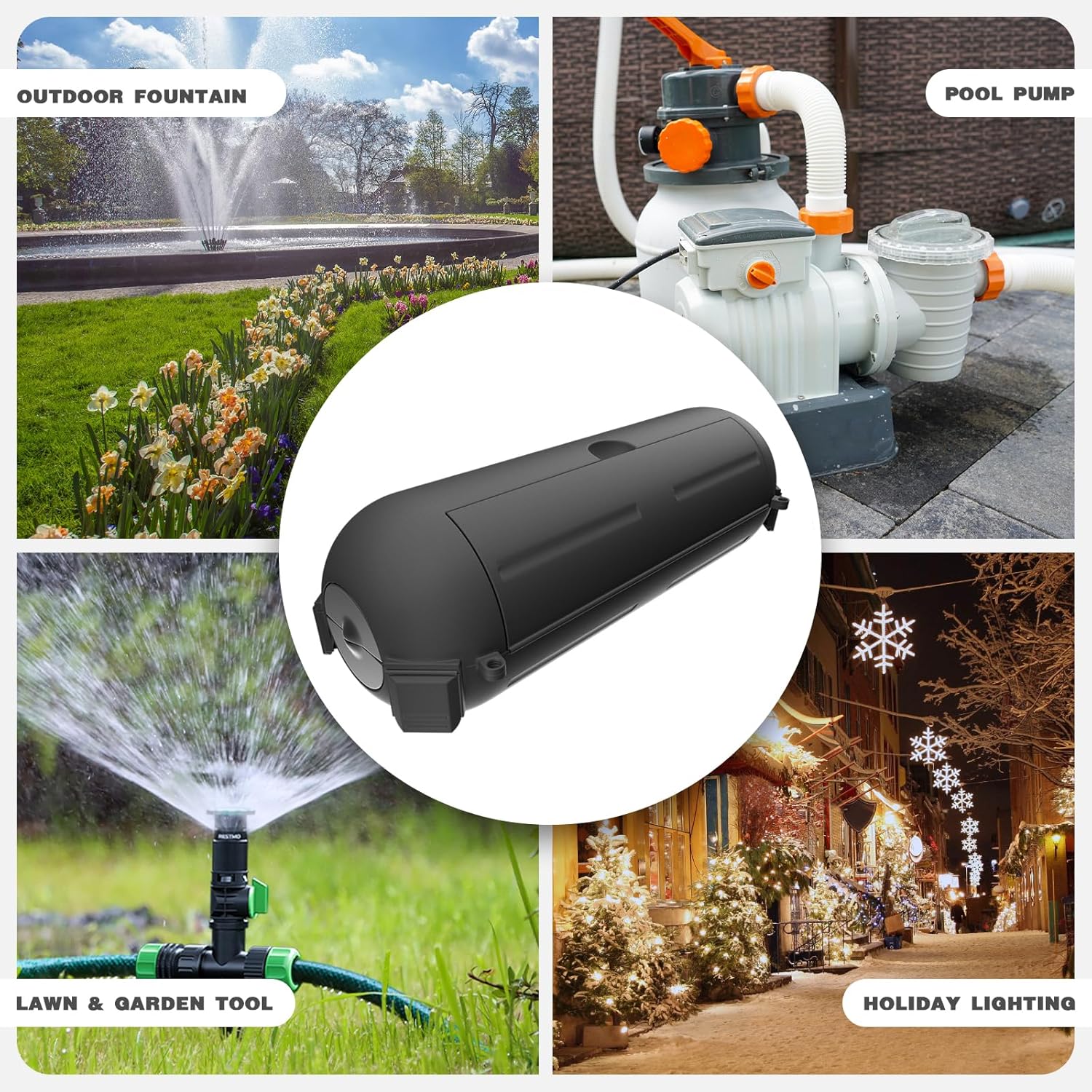 - Ideal for a wide range of outdoor & indoor applications including lawn and garden power tools, Christmas holiday lighting, landscape decorations, pool pumps, fountains, fish ponds, patio heaters, air conditioners, security cameras and more.