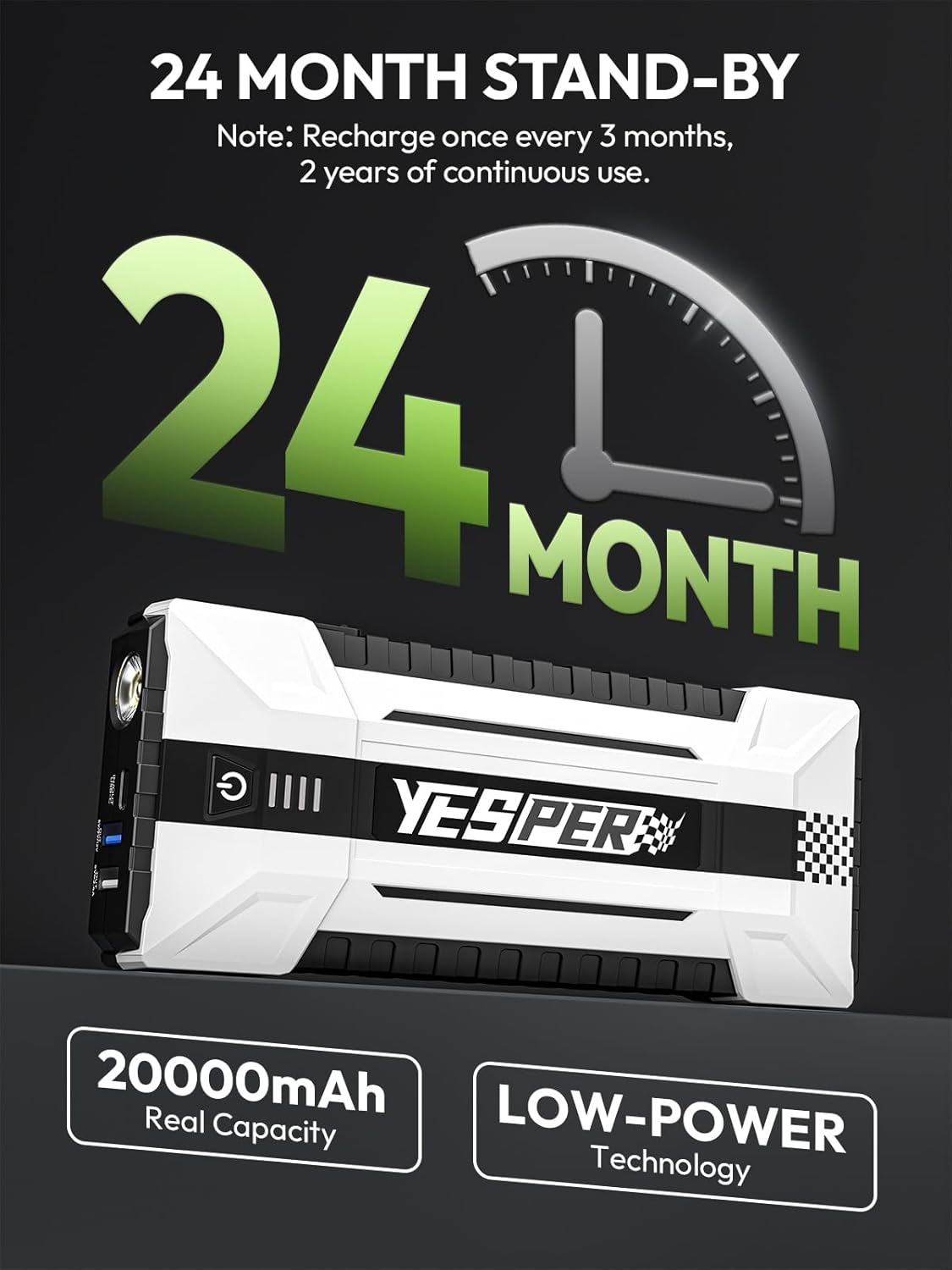 - Powerful Emergency Jump Starter -- YESPER YJS20 car battery jump starter with a peak current of 3000 amps is perfect for starting 12V vehicles such as cars, trucks, boats and large vehicles (up to 10L gasoline engines and 8L diesel engines); and equipped with a powerful 20000mAh battery, it can achieve 50 quick starts and can work properly even in extreme climate conditions from -4 to 140ยฐF