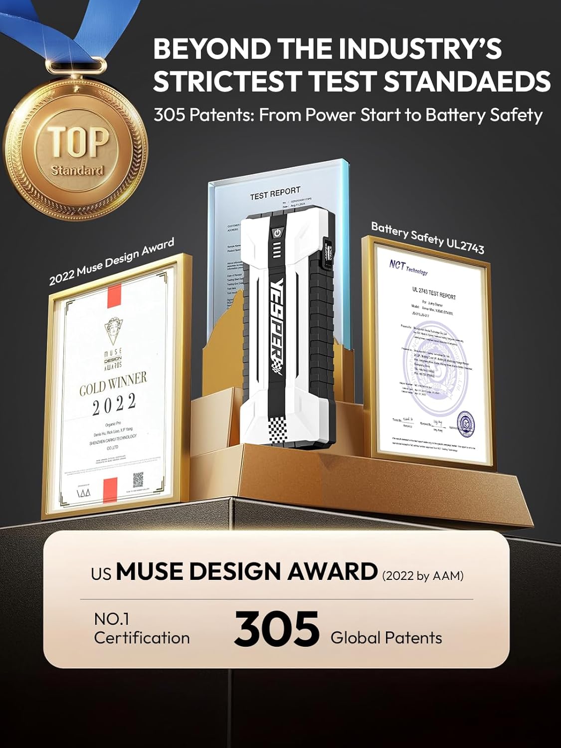- DSLI IV Intelligent Control Technology -- Compared with the previous generation technology, DSLI IV reassembles the structure and microcomputer control program, the voltage is increased by 30% to 14.8V, the starting current peak reaches 3000A, to start the car in 1 second, and the powerful intelligent temperature control technology reduces the starting temperature; helping you start faster, stronger and safer