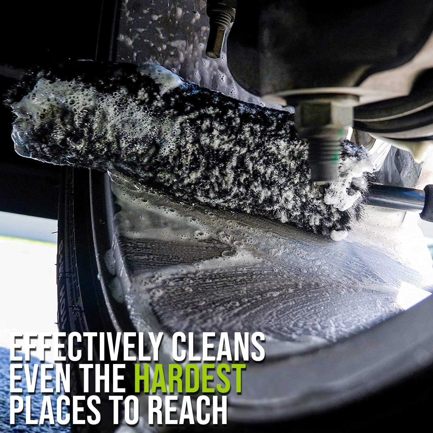 - EASY ERGONOMIC ANGLING: Get into all those awkward, tight spots that are nearly impossible to reach with a rag, sponge, or straight brush. This pair does it all – those tight spots around the center cap and lug nuts, behind the spokes, and more. Featuring an EVA foam grip that gives you greater control over the brush and more comfort, especially when cleaning those hard-to-reach places.