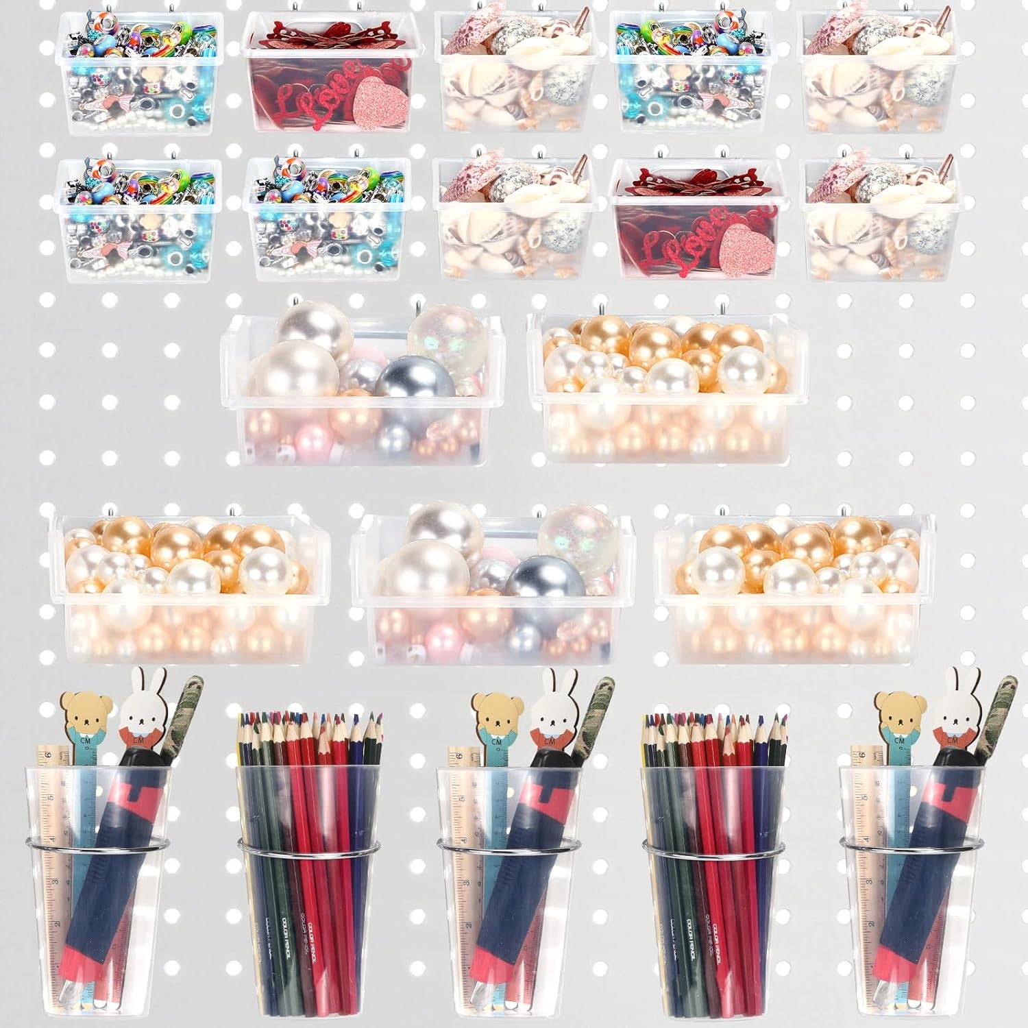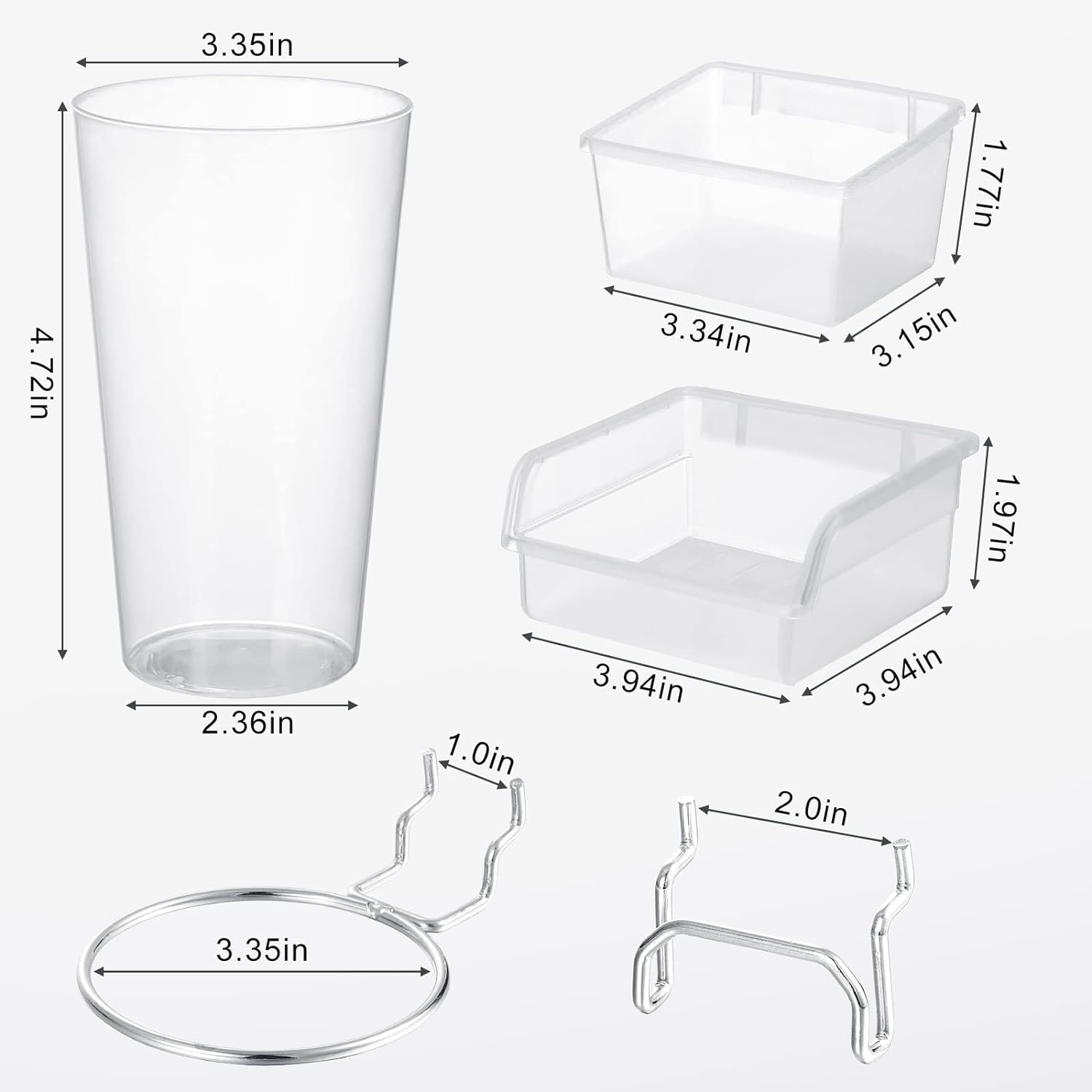 - Diverse Heavy Duty Size: you will receive 5 pieces of pegboard cups in 3.35 - 2.36(D) x 4.72(H) inches,15 pieces of peg board bins in different sizes, namely 3.54 x 3.15 x 1.77 inches (L x W x H), 3.94 x 3.94 x 1.97 inches (L x W x H), coupled with metal cup hooks in 3.35 inches and 2 inches loop pegboard, the diverse size and enough quantity to meet your various needs; Note: the pegboard is not included