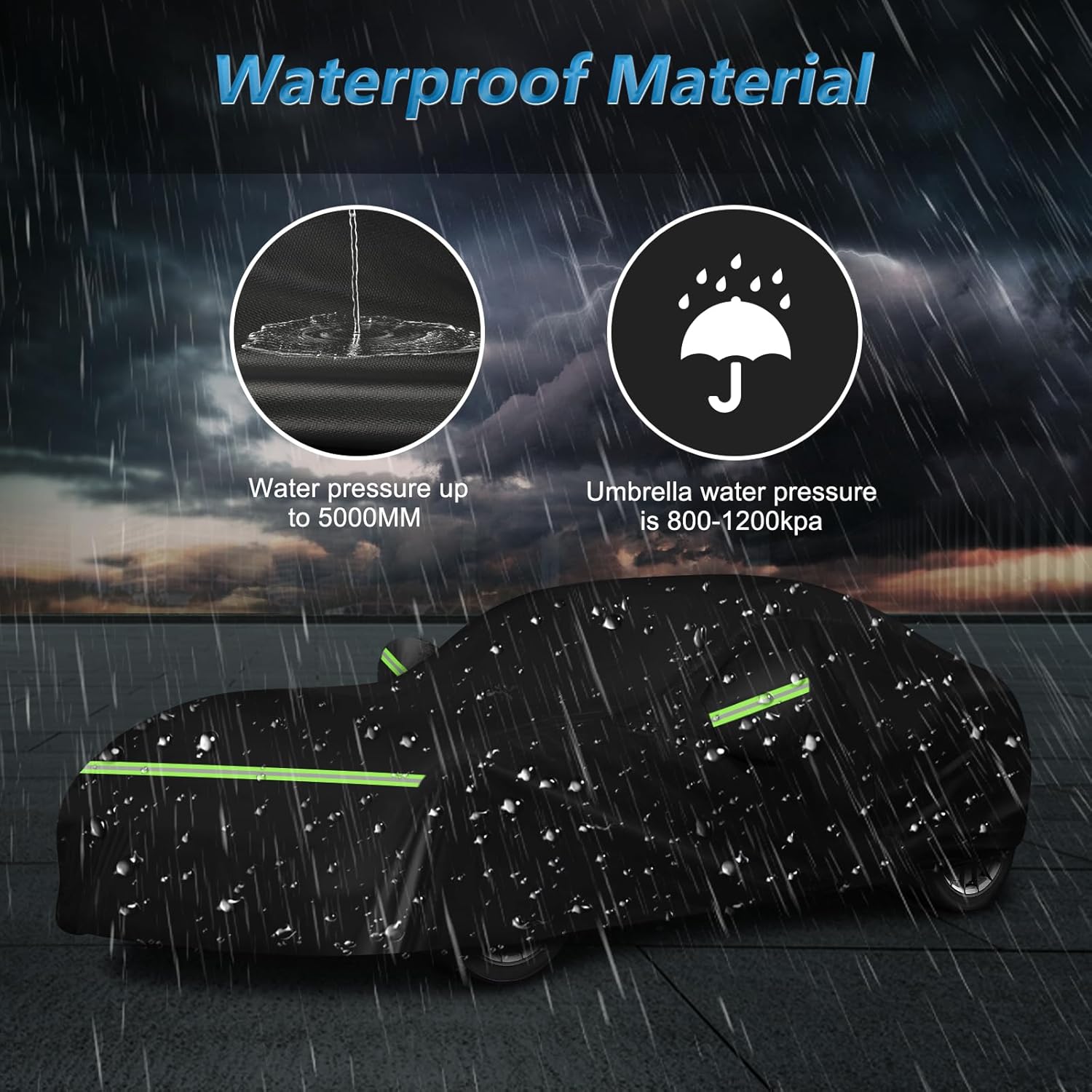 - ăUpgraded Windproof Design-Stay in Placeă*1. Four straps used on the four wheels to make sure the cover stay in the place. *2. A windproof buckle pass through the middle of the car. *3. Elastic hem at the bottom of front and rear to ensure cover fit your car and to protect your car cover from blowing off, even in heavy wind. *4.There are two extra-long straps for the hood and rear wind protection.