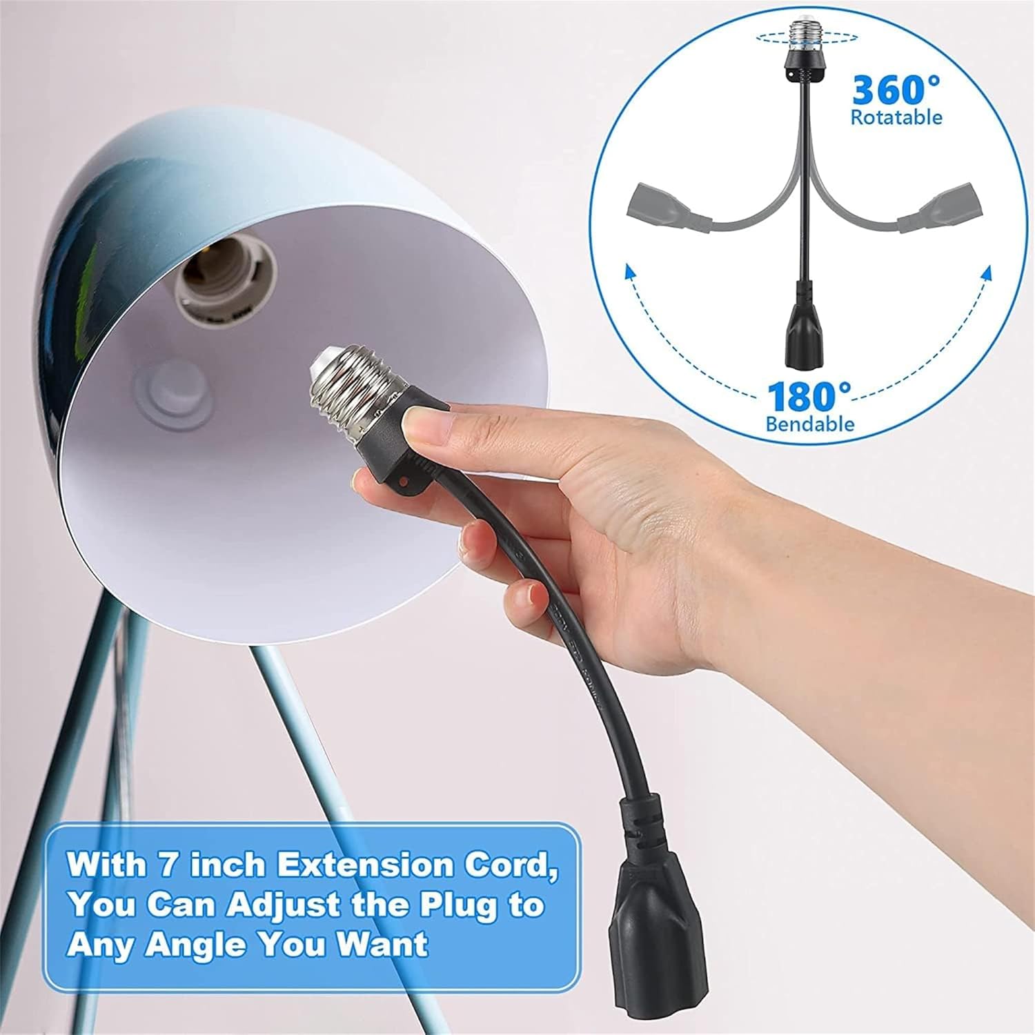 - Light Socket Adapter with Extension Cord: the bulb socket adapter is powered by 125V AC, 10A, 1250W, with 7 inch extension cord, which is nice for you to plug in any direction(Note: When the current exceeds 10A, the fuse will be cut off to avoid fire danger, it is recommended not to use high current for a long time)