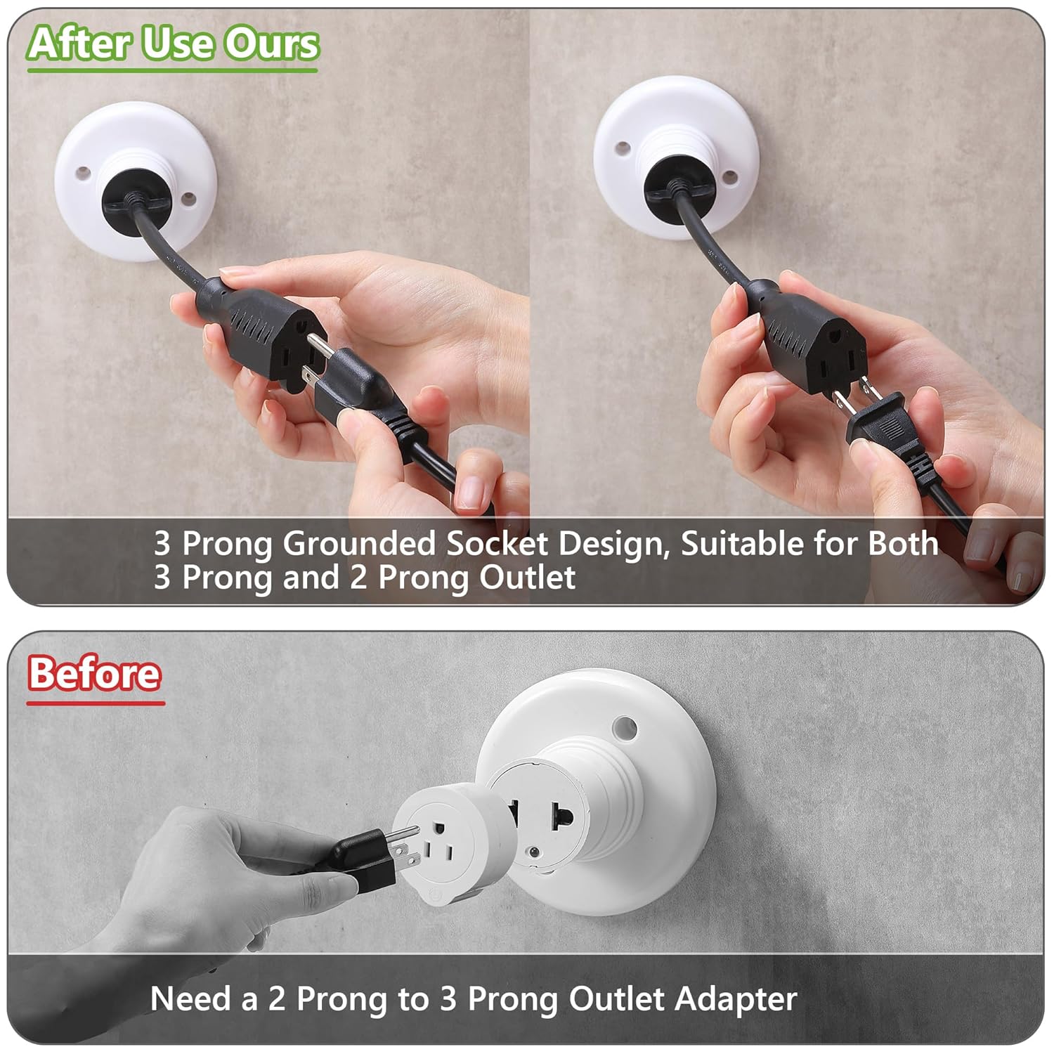- 3 Prong Outlet Socket Adapter: with 3 prong design, you can use it both as 2 prong socket and 3 prong socket, no need to use the 2 prong to 3 prong grounding adapter, more convenient