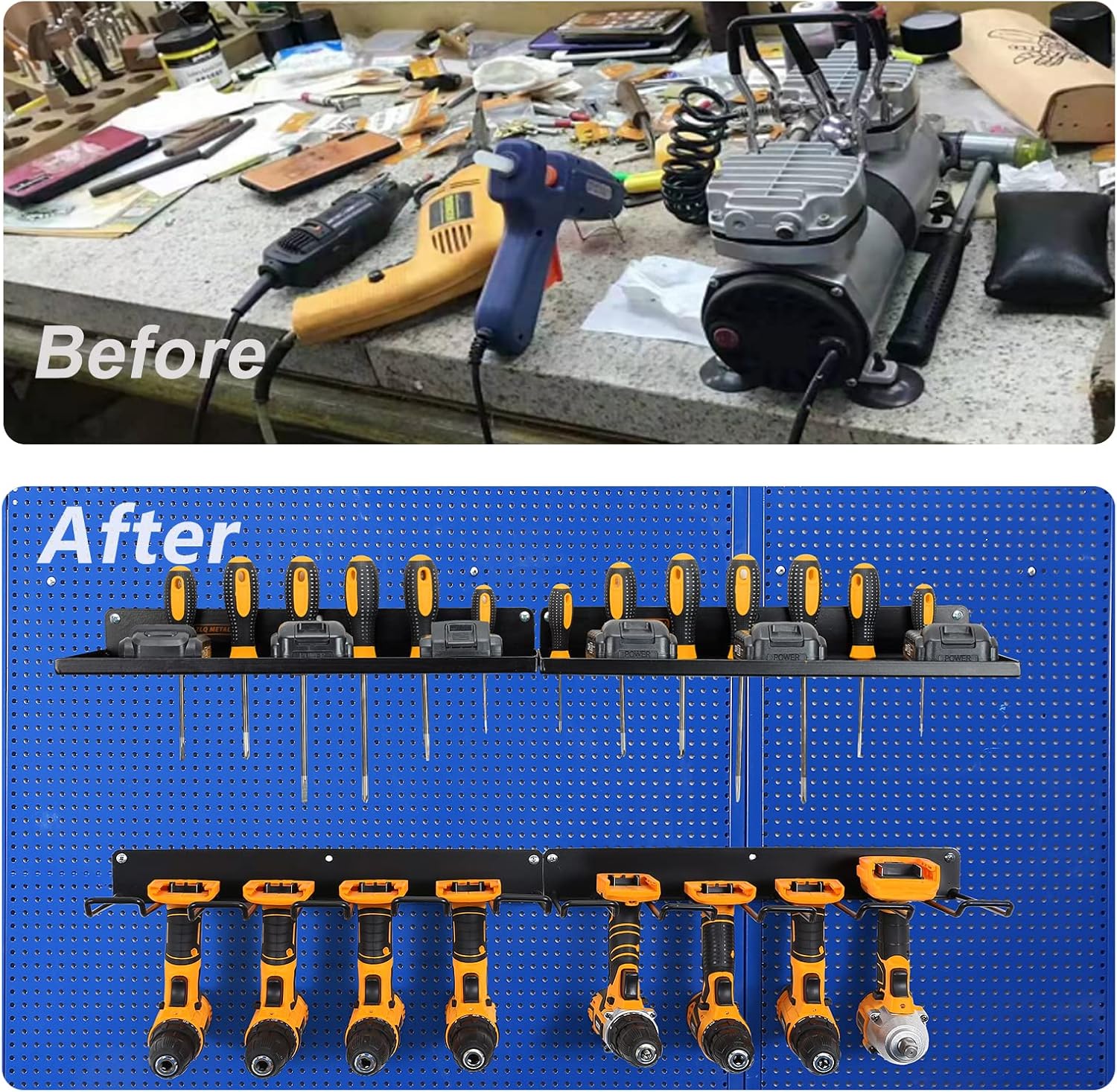 - Organize Power Tools: This organizer holds power tools and drill accessories on the wall for easy access and organization.