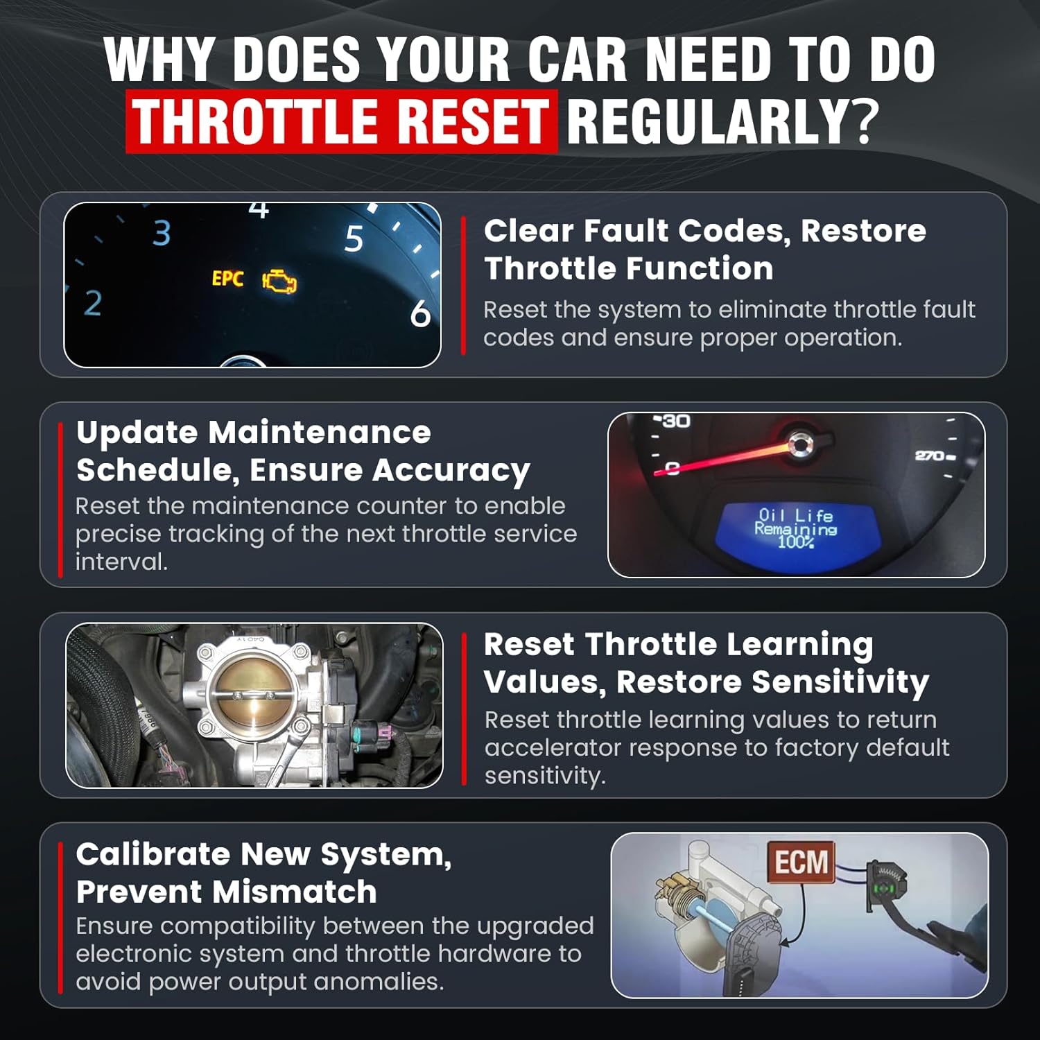 - 【Resetting System Prompts After Oil Change】 Modern vehicle ECUs (Engine Control Units) automatically calculate oil life based on mileage, time, or sensor data. When the oil life falls below a preset threshold (e.g., 10%-15%), a "Change Oil" prompt appears on the dashboard. After completing an oil change, you need to perform a reset operation using the IF740 OBD2 scanner to clear the ECU's recorded old oil life data, allowing the system to restart its calculation and avoid false alerts.