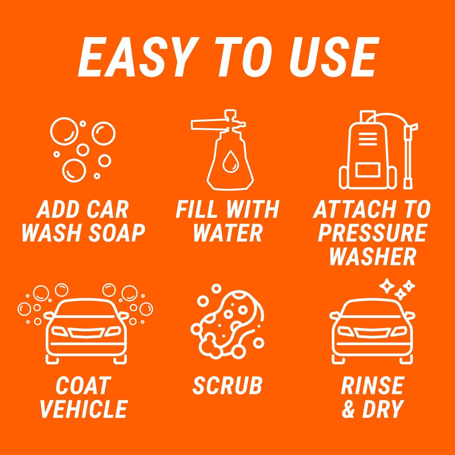 - [Additional Features]: Features a non-slip grip, wide non-tip bottle and marked lines on the reservoir for easy use, as well as works with both gas and electric pressure washers from 500 to 3,500 PSI