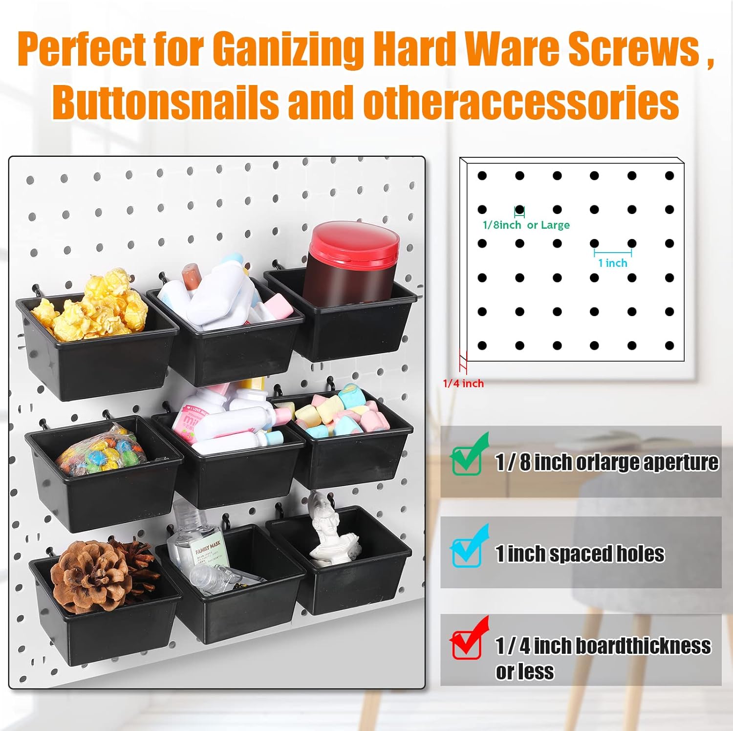 - Diverse Heavy Duty Size: you will receive 5 pieces of pegboard cups in 3.35 - 2.36(D) x 4.72(H) inches,15 pieces of peg board bins in different sizes, namely 3.54 x 3.15 x 1.77 inches (L x W x H), 3.94 x 3.94 x 1.97 inches (L x W x H), coupled with metal cup hooks in 3.35 inches and 2 inches loop pegboard, the diverse size and enough quantity to meet your various needs; Note: the pegboard is not included