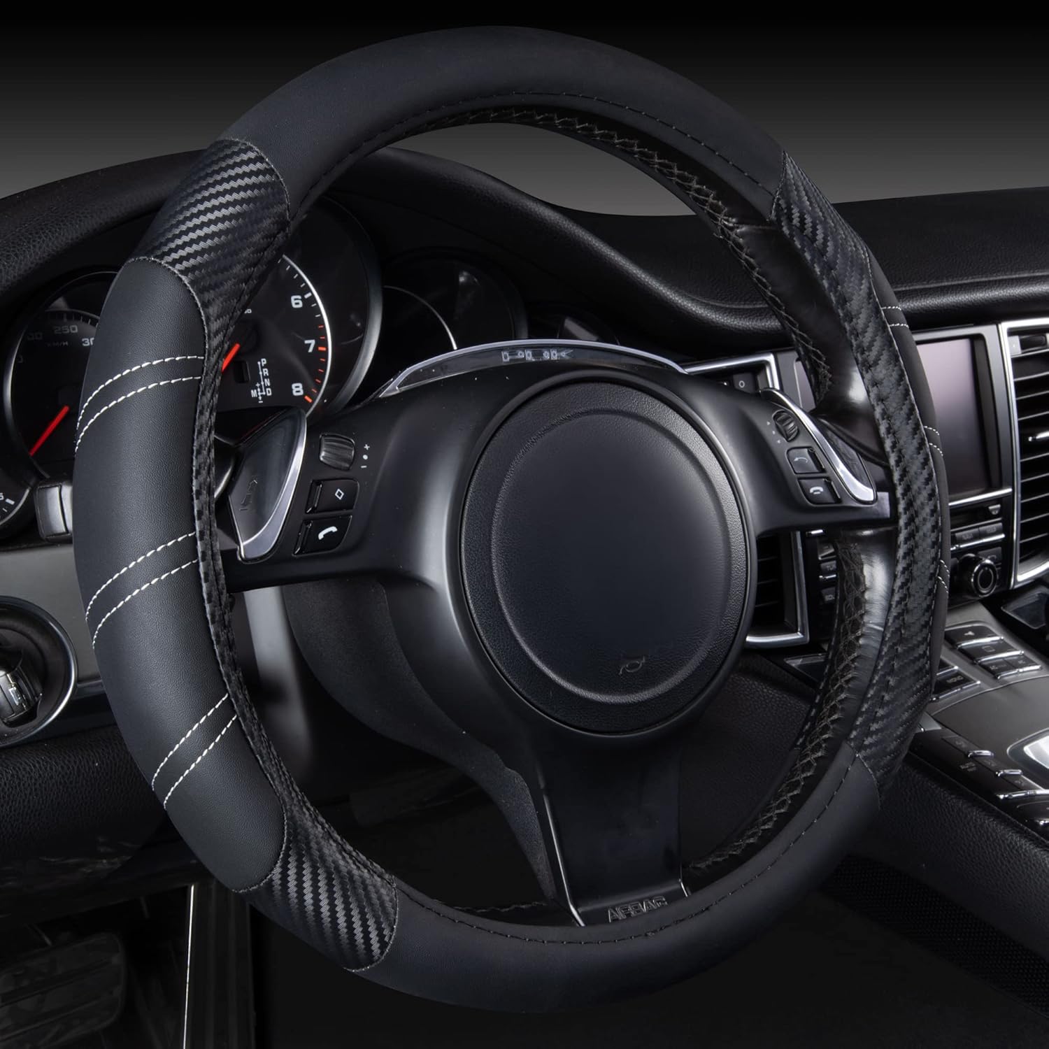 CAR PASS Line Rider Microfiber Leather Sporty 14.5-15 inch Steering Wheel Cover Universal Fits for 95% Truck,SUV,Cars, Anti-Slip Safety Comfortable Design (Black Carbon Fiber)