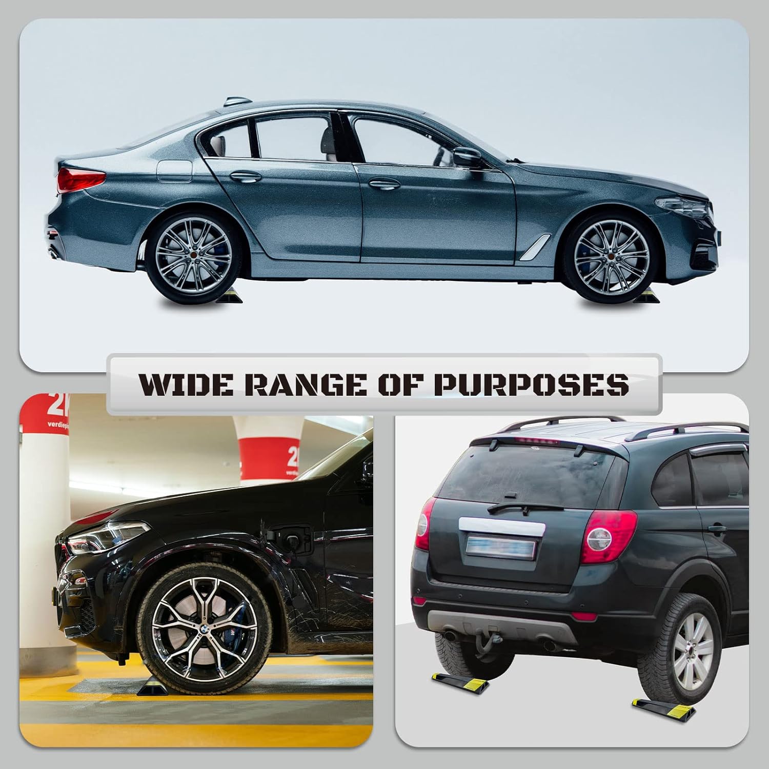 - ECO-FRIENDLY MATERIAL: Our parking aid for garage vehicle is made of environmental protection material with no strong odor like other rubber products. The wheel stops are with conspicuity yellow safety stripes to improve the visibility