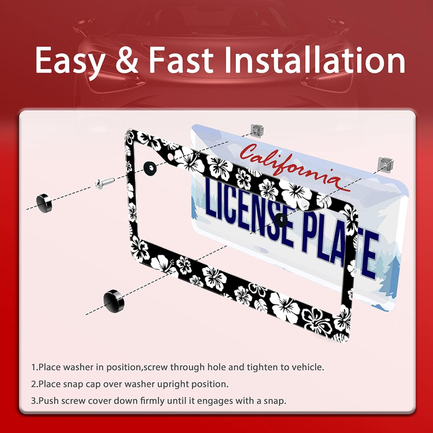 - 【Product Accessories】Our License Plate Frame All Accessories Needed are Included (2 Screw Caps, 2 Screws, 2 Washers).Quick and Simple Installation with Easy to Follow Instructions.Easy to clean, just wipe with a damp cloth