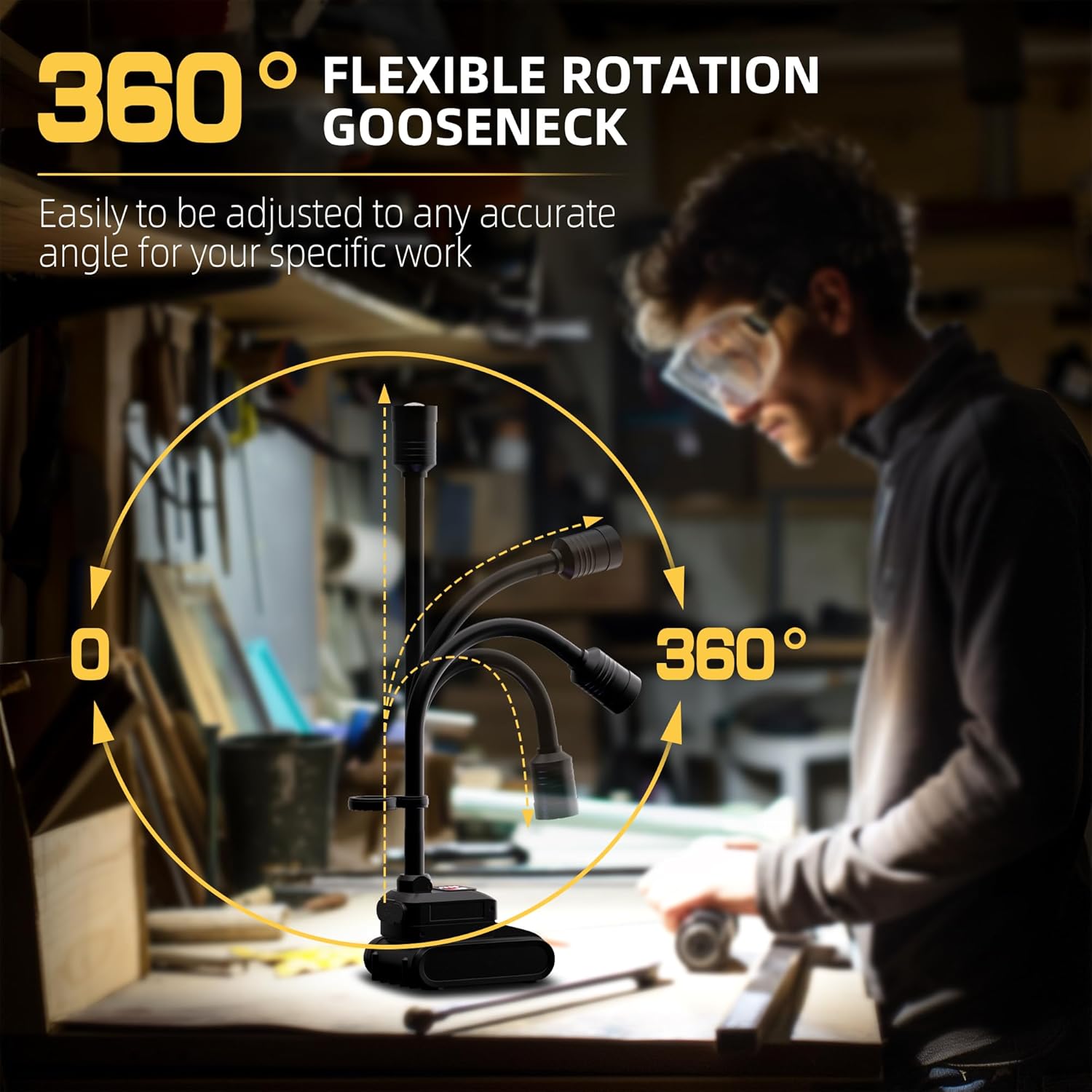 - 【360°Flexible Gooseneck】The gooseneck LED work light features an adjustable angle for various situations, providing wide-area illumination ideal for automotive and shop use. The work flashlight enables you to precisely illuminate deep, narrow, and curved spaces in detail, such as in CNC shops, without springing back or sagging. The folding work light is easy to carry and saves storage space when camping.