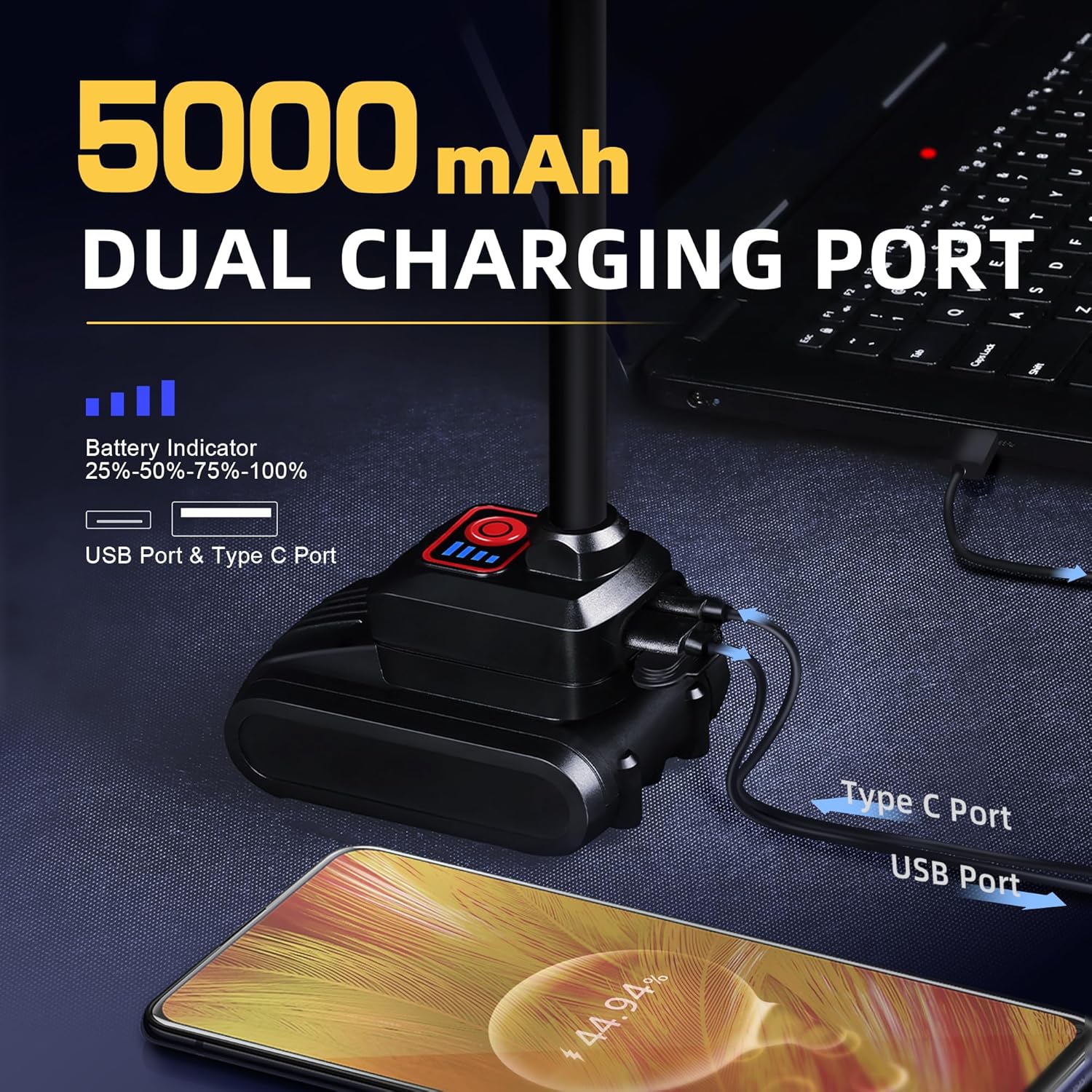 - 【5000mAh Battery & Portable Charger】The rechargeable work light is compatible with PD30W-65W fast charge, featuring a USB-C port to recharge the built-in 5000mAh battery and USB-A ports to charge phones or other small electronic devices when outlets are unavailable. It can last for 18 hours in low brightness and 5 hours in high brightness. Charging time is only 5–5.5 hours (5V, 2A Type-C). The built-in power indicator makes it easy to to check the remaining battery power in the event of a power outage.