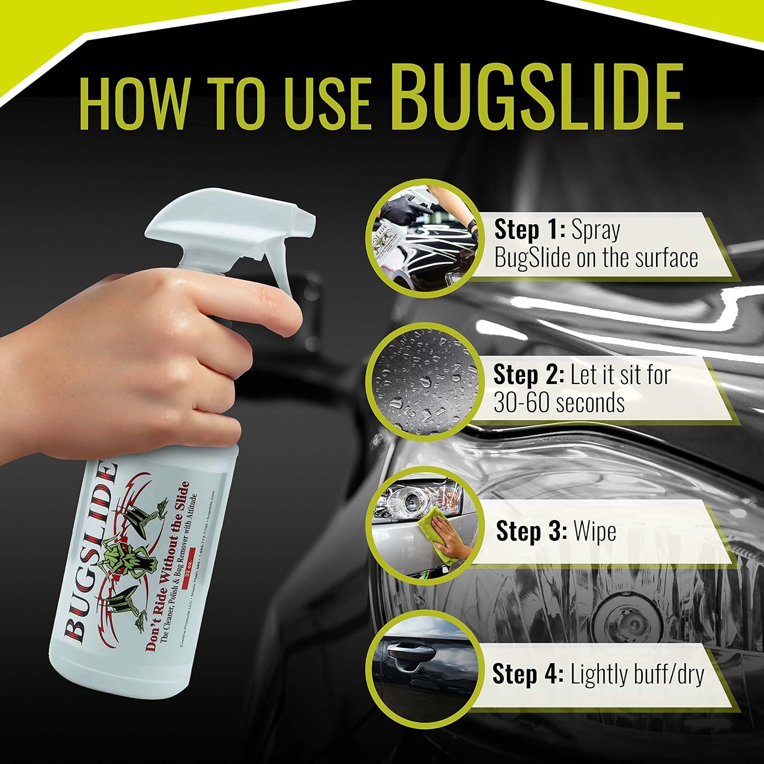 - All-In-One-Cleaner and Detailer – Care for your vehicles year-round with Bugslide's cleaning and detailing spray. Use on your vehicle's body, mirror, window, windshield and more for ultimate shine. Solution is completely waterless, scratch free and takes off bugs and other surface contaminants with ease.