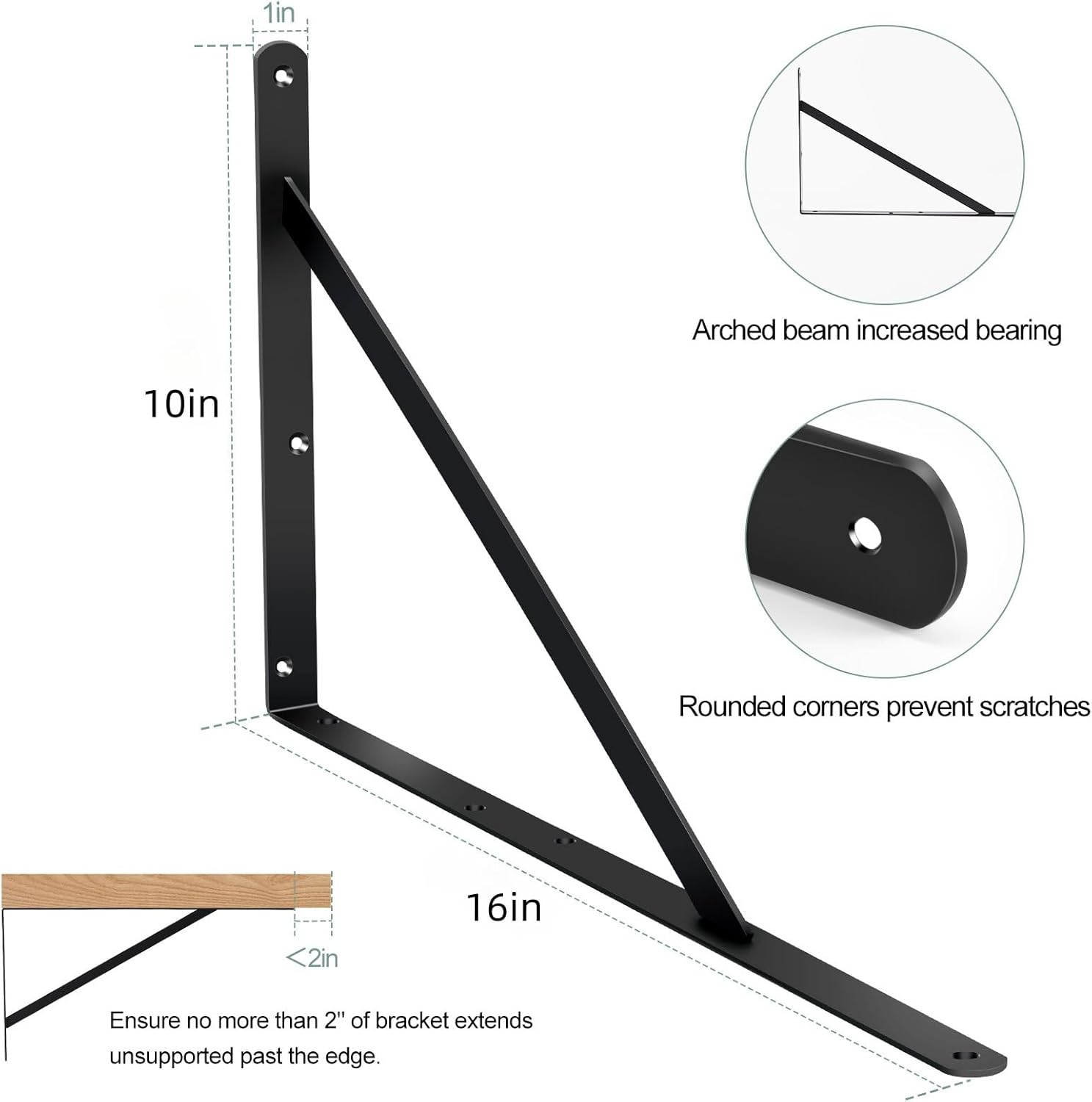 - Size:L 16" x H 10" x W 1", 3mm Thick. Package included: 12 x Brackets , 36 x long Screws, 48 x short Screws(Wood plank is Not included)Our floating shelf brackets come with 12 brackets for your wall mounted shelves.Our heavy-duty brackets can support Audio Equipment,bookshelf,kitchen ware,electric power tools , TV bench ,farm tools,etc.