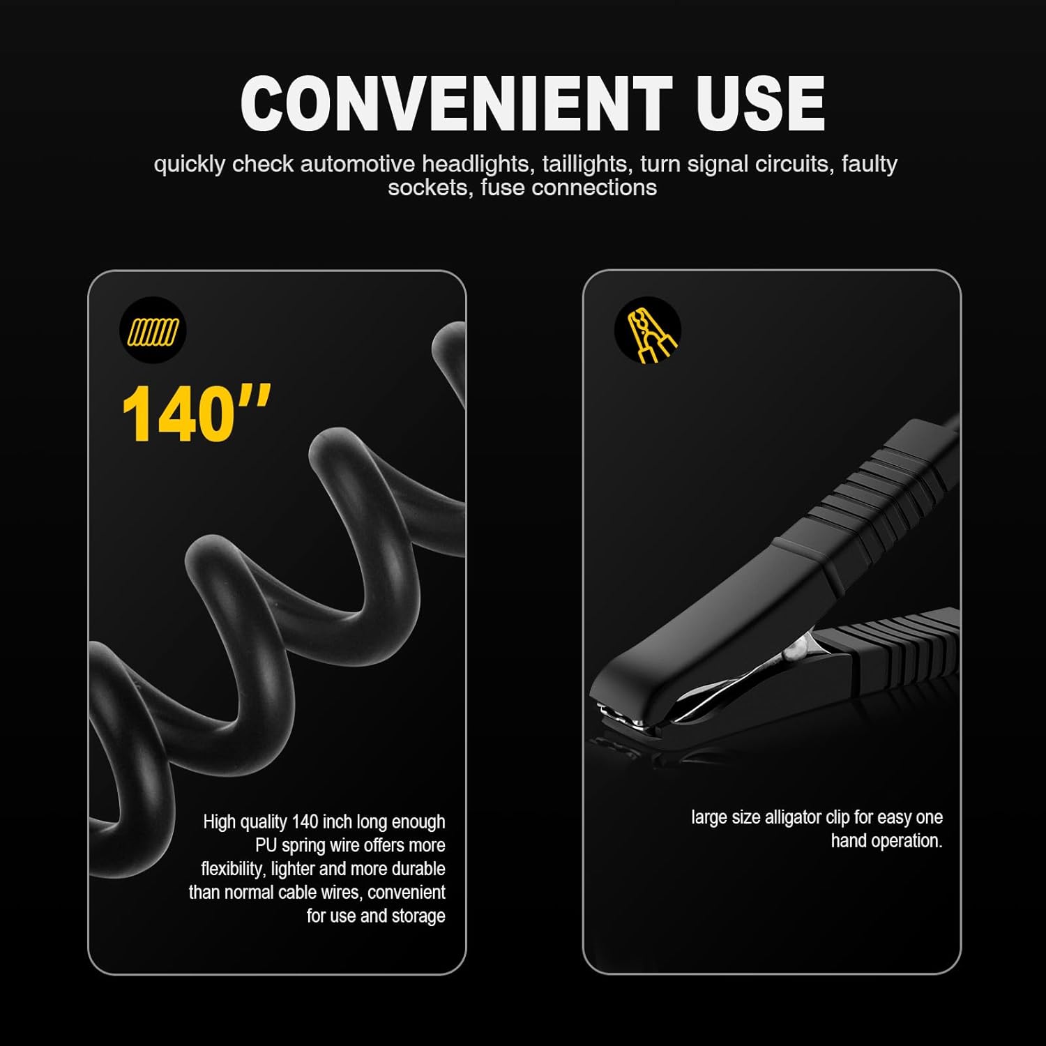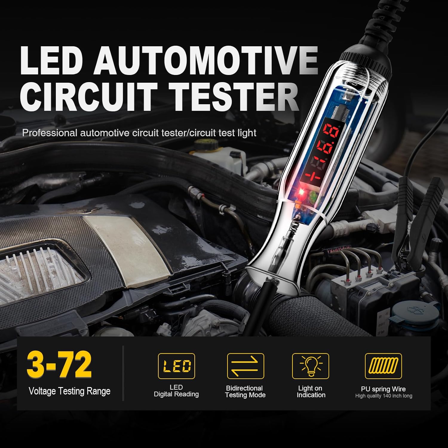 - [Wide Application Than Others] This professional automotive circuit tester/circuit test light with 3-72V DC voltage testing range, ideal for checking various vehicles electrical circuits, quickly check automotive headlights, taillights, turn signal circuits, faulty sockets, fuse connections, also for voltage testing other 3-72v DC wirings and circuits.