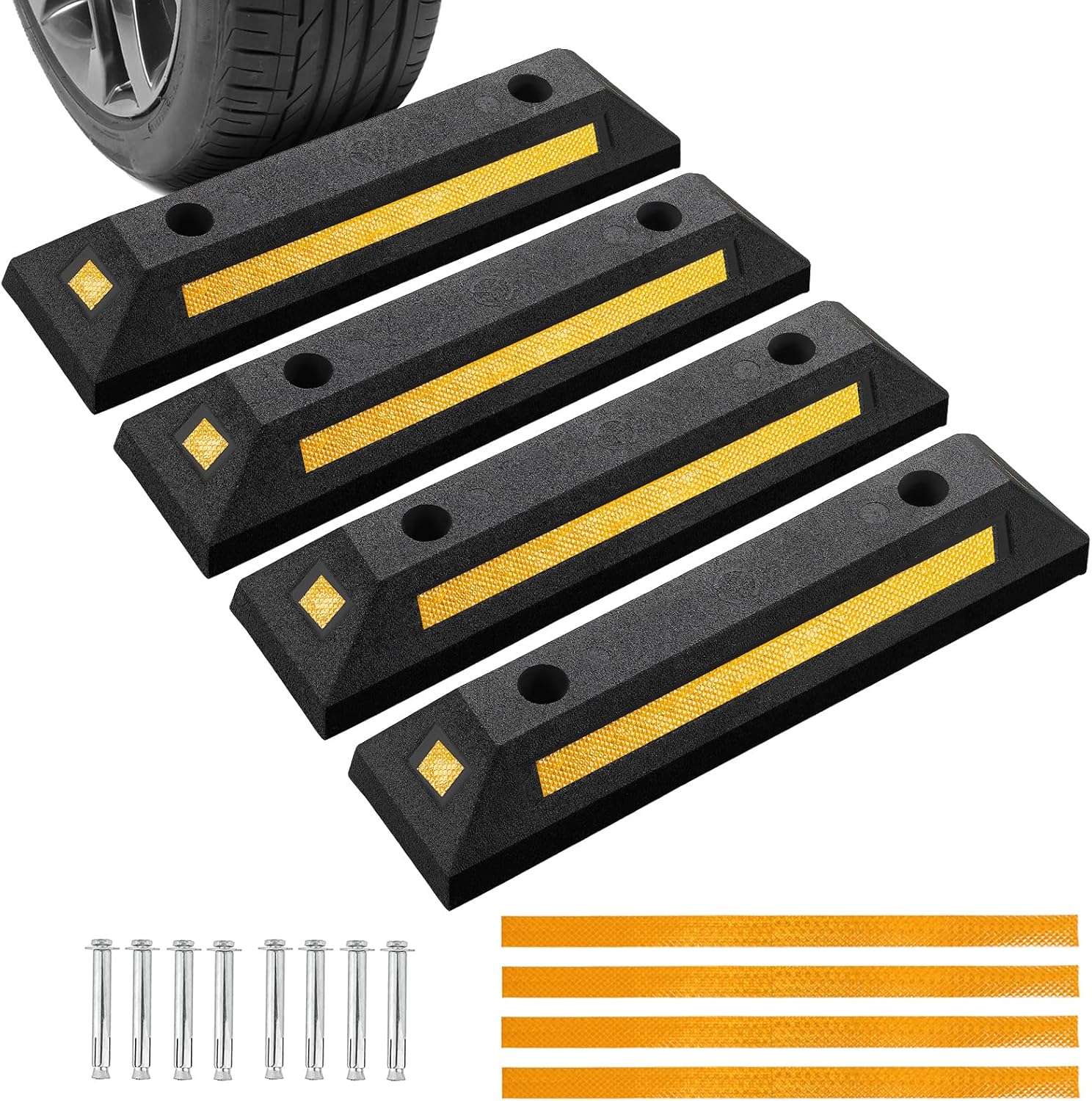 - High Visibility: The black rubber wheel stopper has a prominent three-way yellow reflective safety strip for better visibility at night or in dark places such as underground.