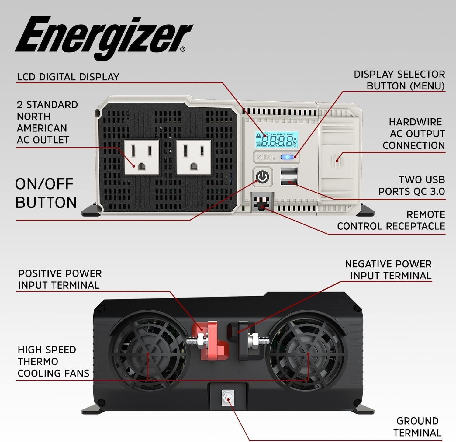Energizer 3000W Pure Sine Wave Inverter 12V DC to 120V AC Converter for RV, Truck, Off-Grid Solar Power Inverter 12V to 110V W/QC 3.0A Each USB Port, AC Hardwire Port, Remote Cables Fuse Included